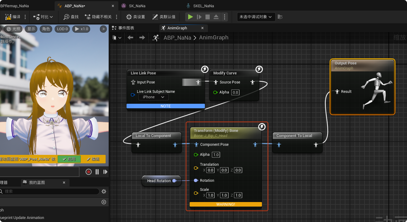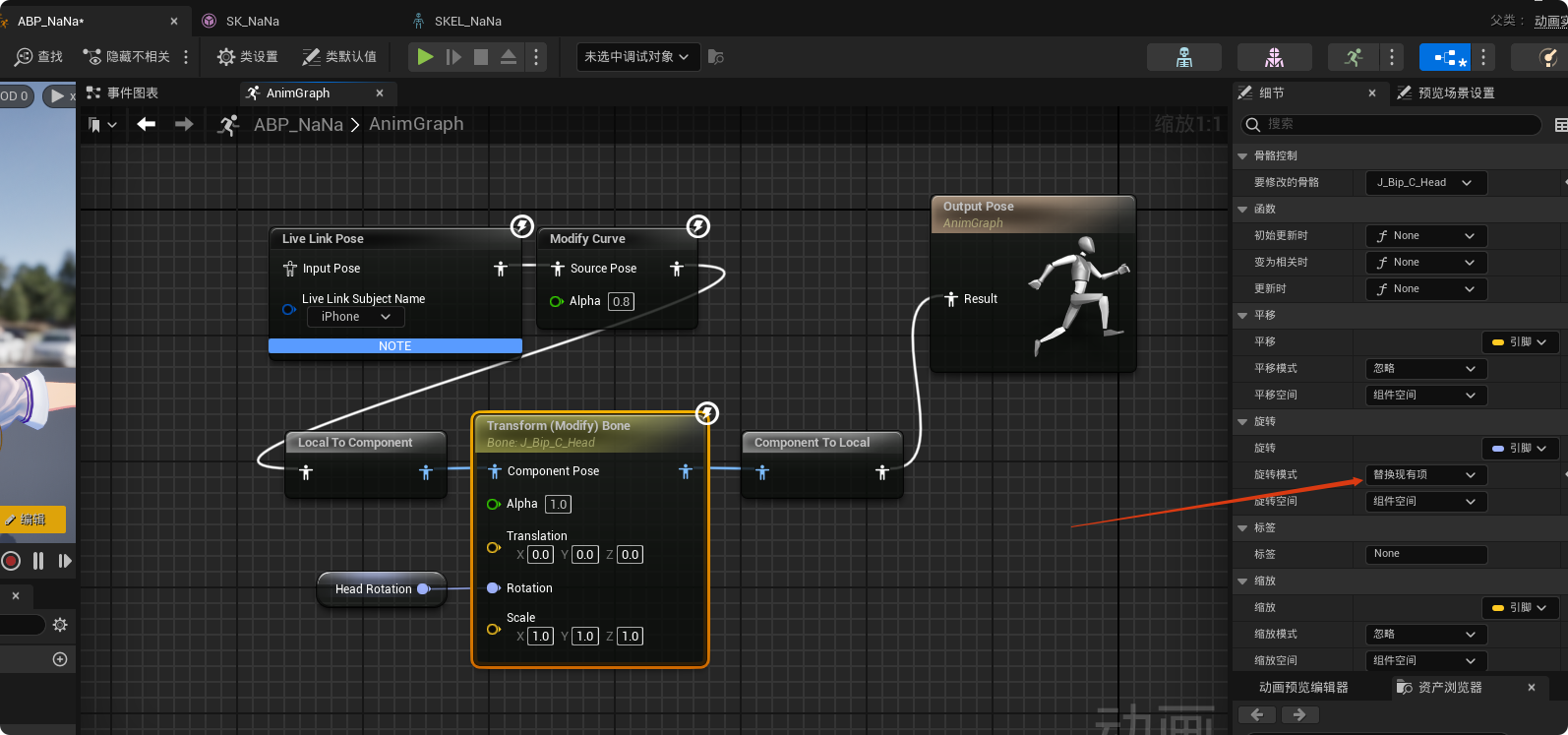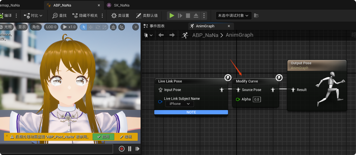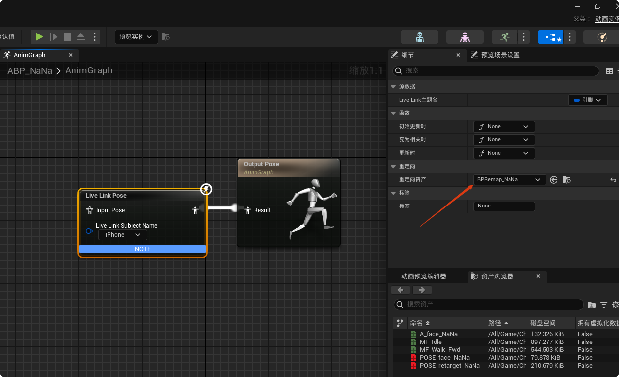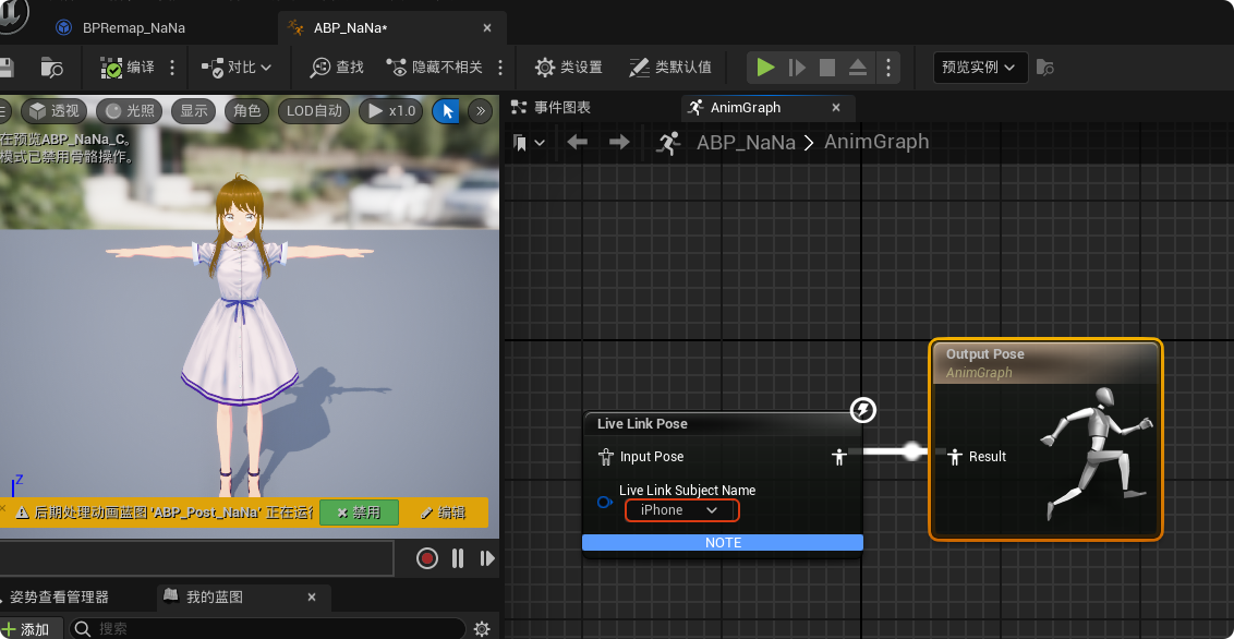 打开"ABP_NaNa",添加一个"Live Link Pose"节点,参数"Live Link Subject Name"设置为"iPhone"