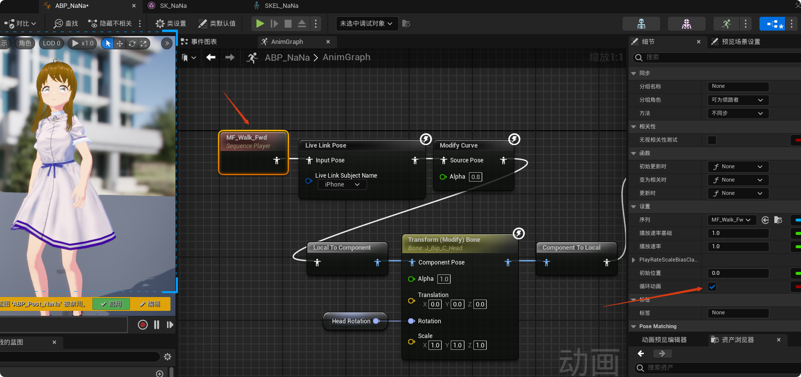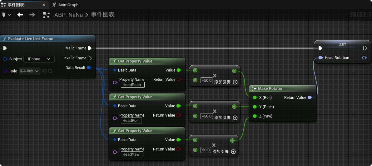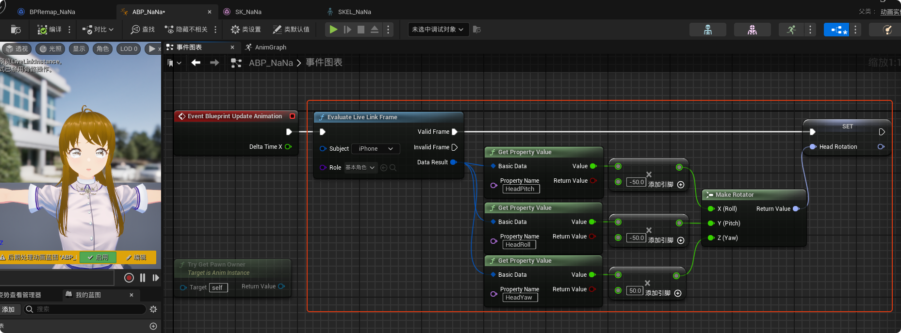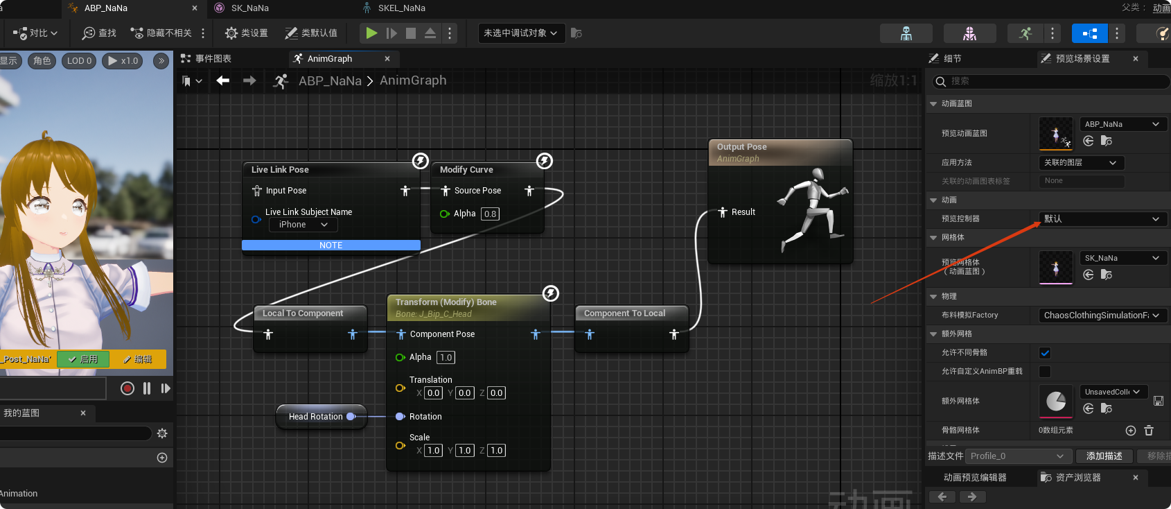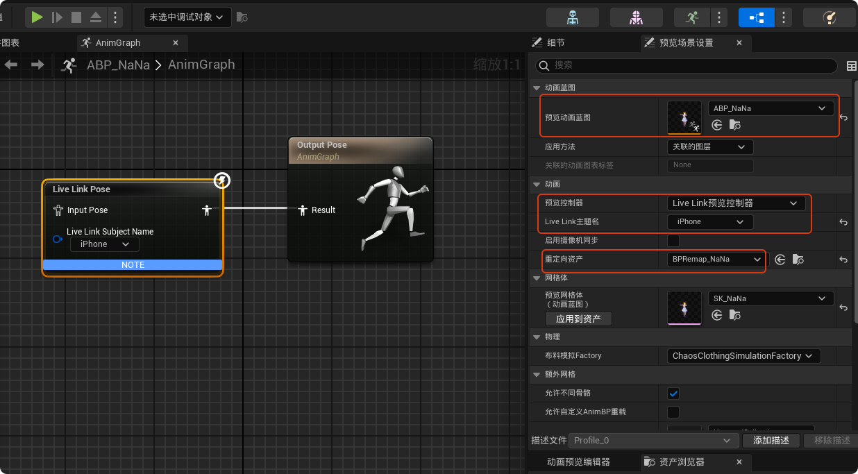 打开"ABP_NaNa",添加一个"Live Link Pose"节点,参数"Live Link Subject Name"设置为"iPhone"