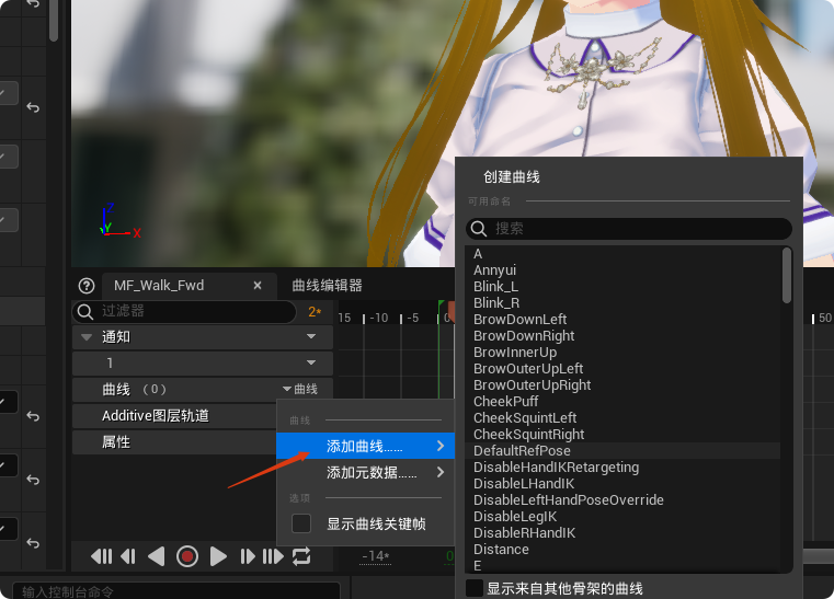 我们可以手动添加一些控制面部表情的曲线。点击"曲线-》添加曲线"