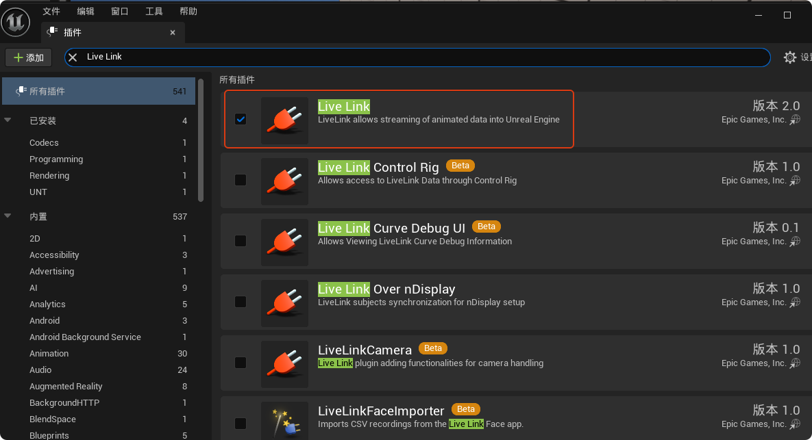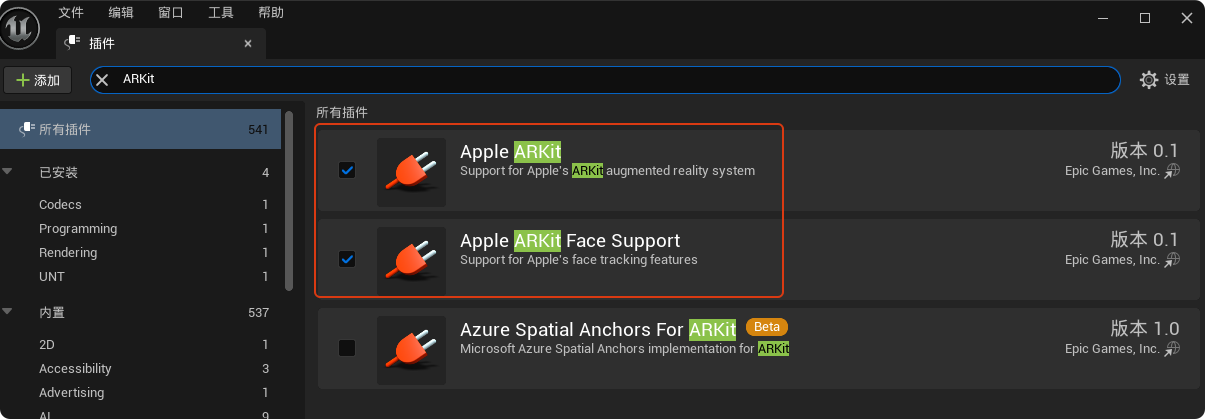 开启插件"Apple ARKit"和"Apple ARKit Face Support"