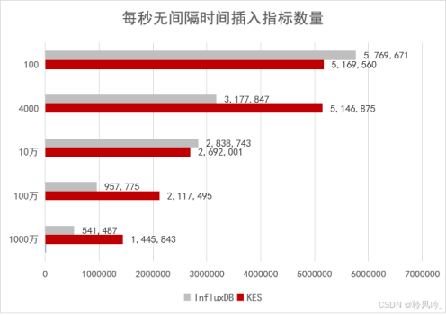- 当设备规模为4000台(每台设备含10个指标)时,金仓数据库的每秒数据插入指标数达到InfluxDB的162%;