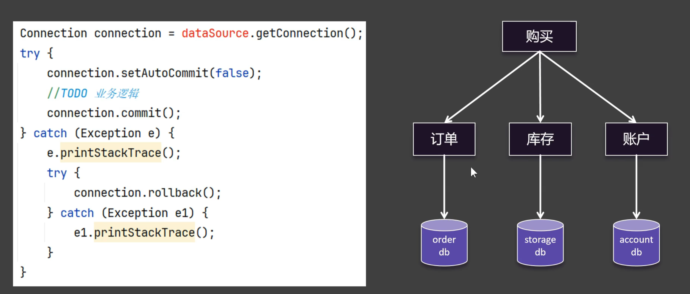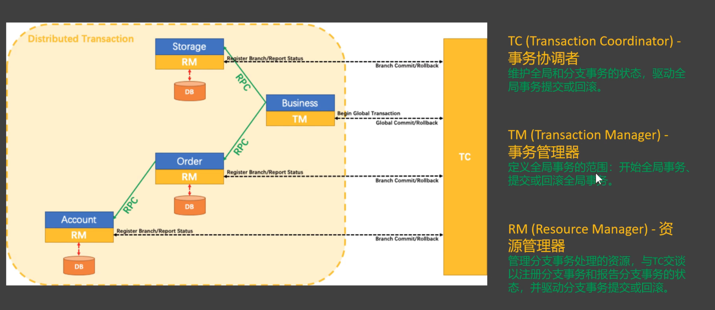 TM请求TC开启一个全局事务,TC会生成一个XID作为该全局事务的编号,XID会在微服务的调用链路中传播,保证将多个微服务的子事务关联在一起;RM请求TC将本地事务注册为全局事务的分支事务,通过全局事务的XID进行关联;TM请求TC告诉XID对应的全局事务是进行提交还是回滚;TC驱动RM将XID对应的自己的本地事务进行提交还是回滚;