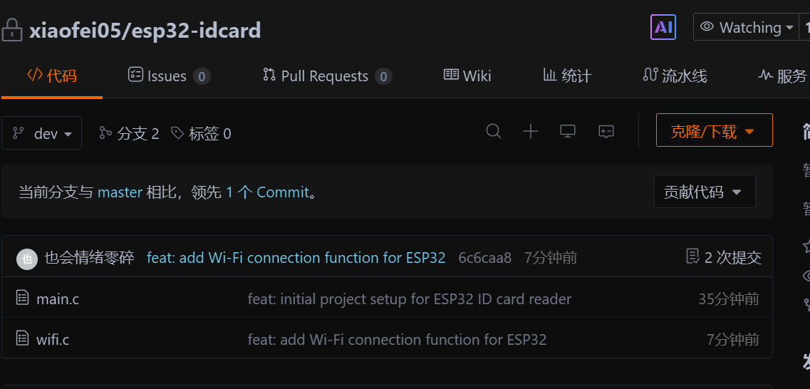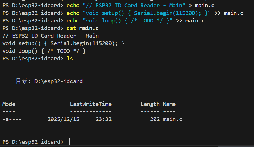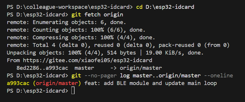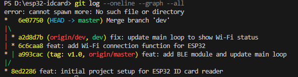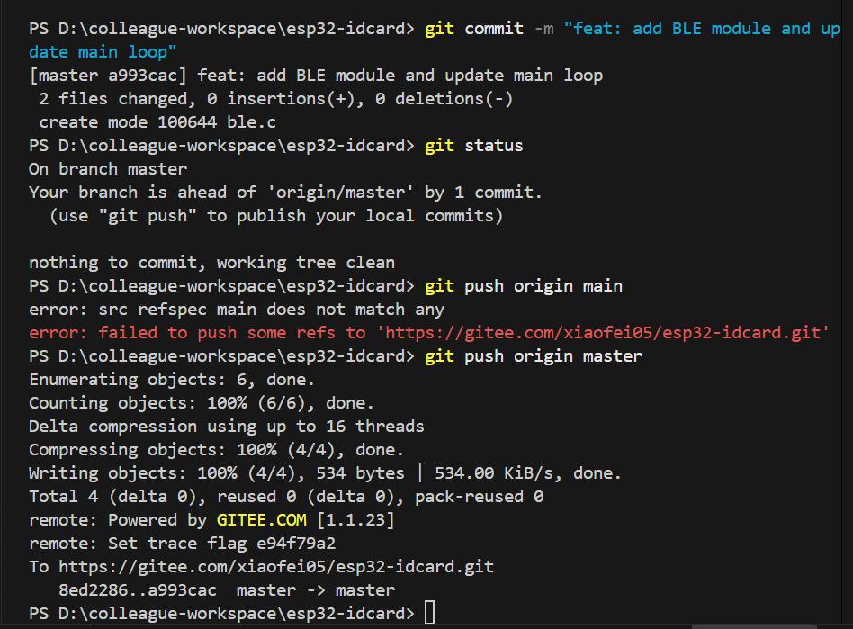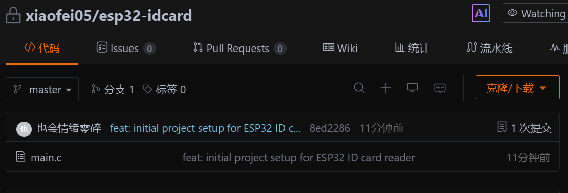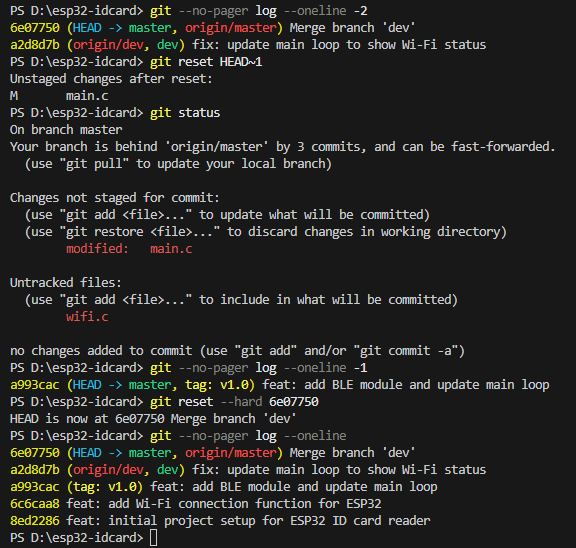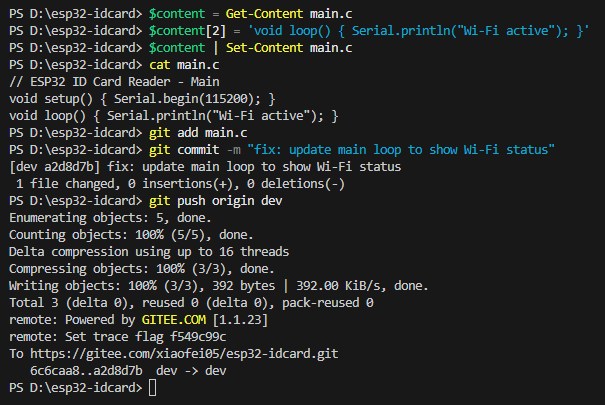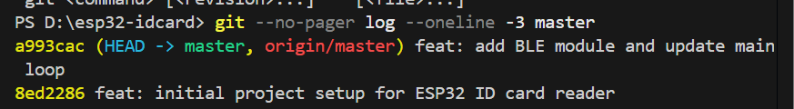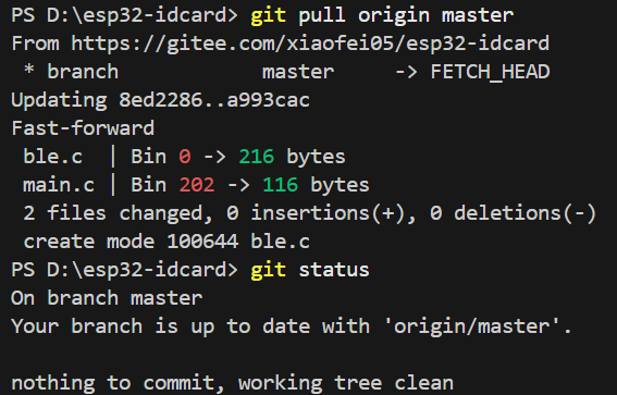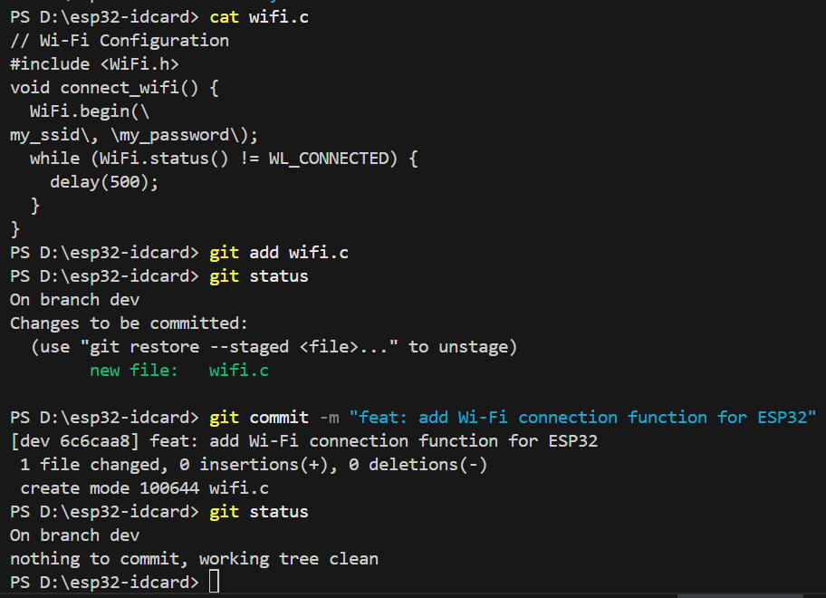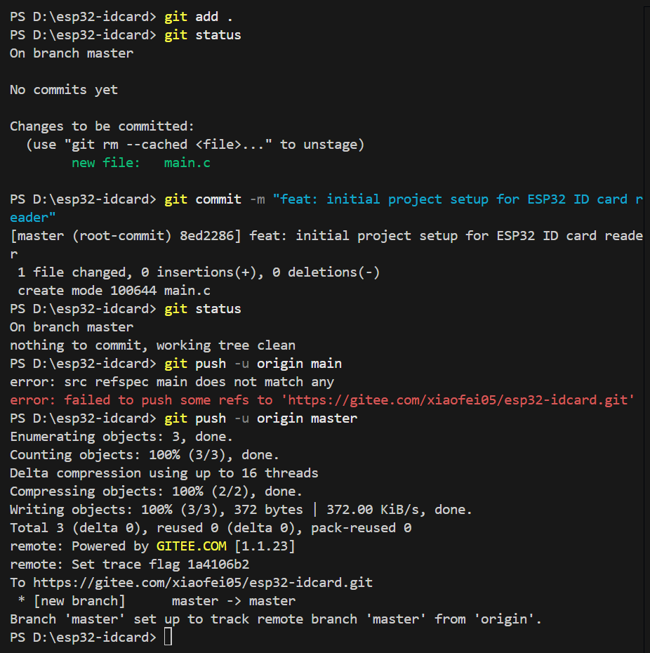 我们使用指令git add . 来将当前目录下所有文件和子目录添加到暂存区,就是为了开始跟踪所有未跟踪的文件,并暂存所有修改。Changes to be committed:表示有改变并将要提交的文件,也给你用绿色列出来了,就是我们刚添加到暂存区的main.c文件。然后我们调用git commit -m "feat: initial project setup for ESP32 ID card reader"这句命令来将暂存区的文件提交到本地仓库