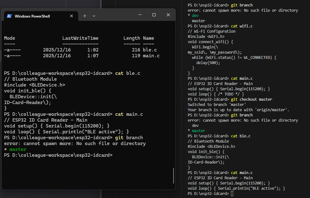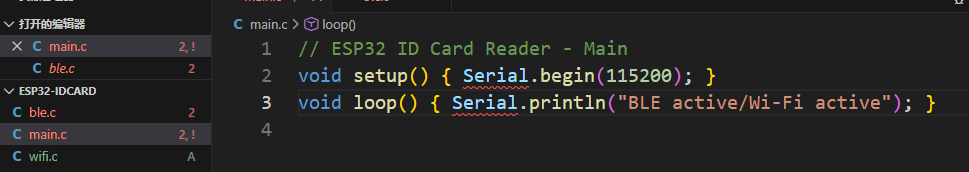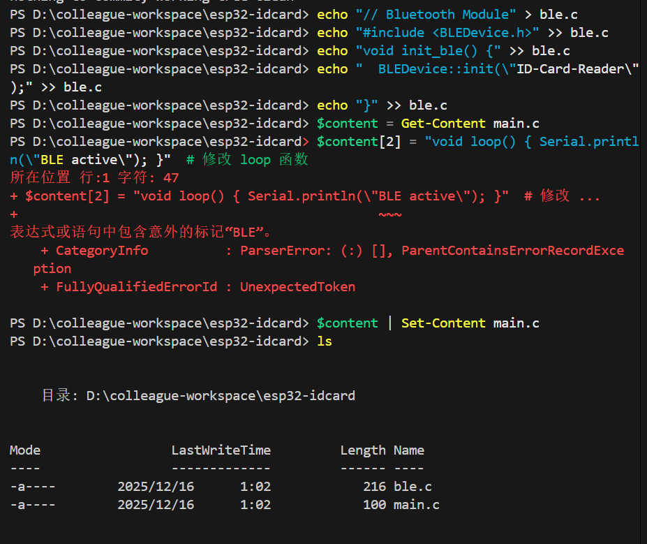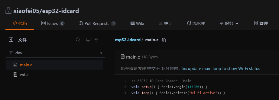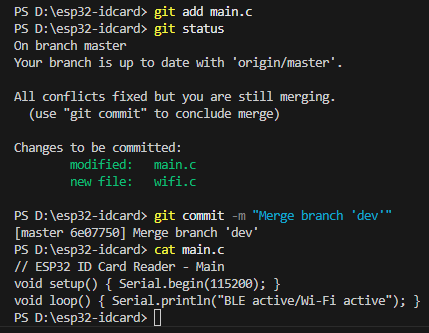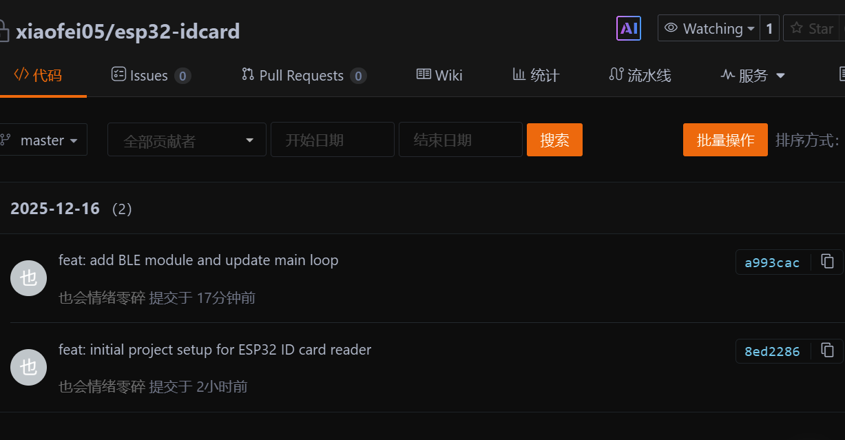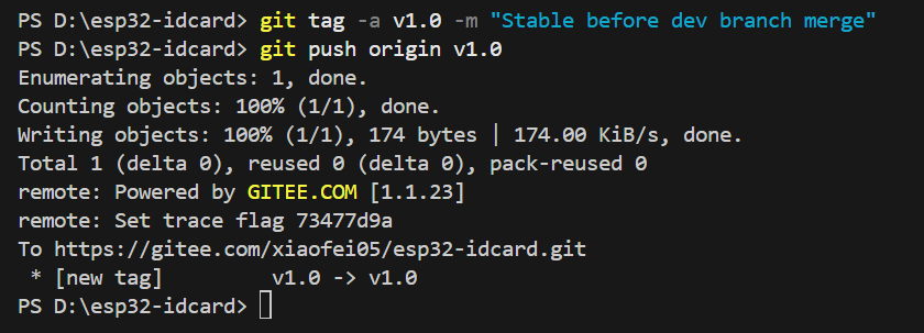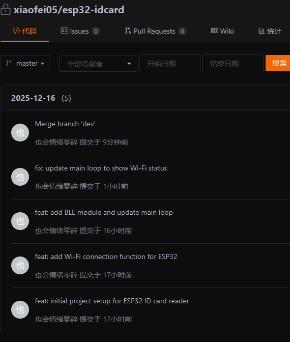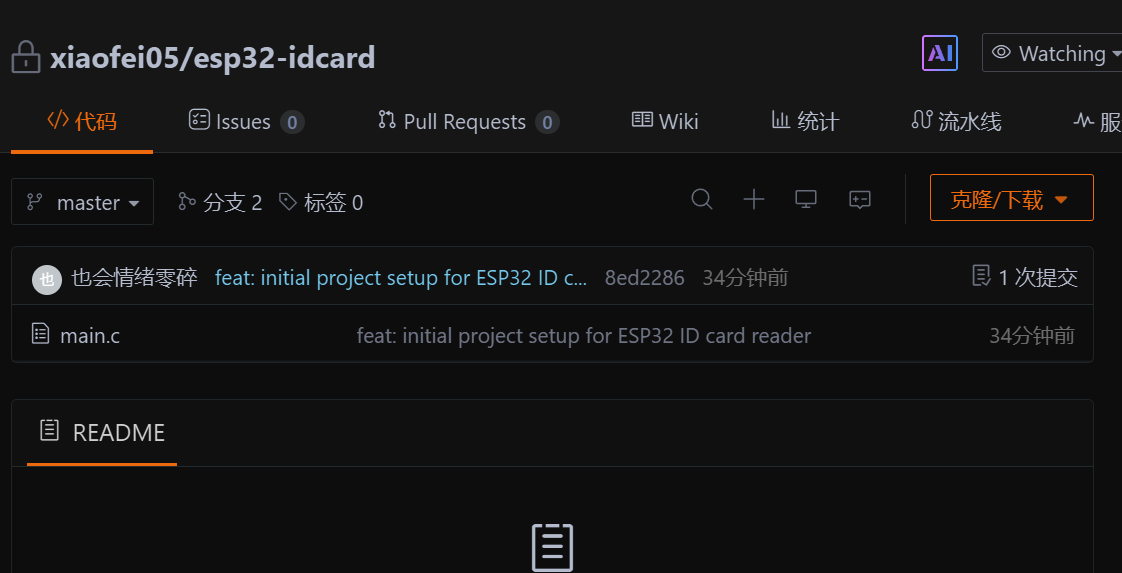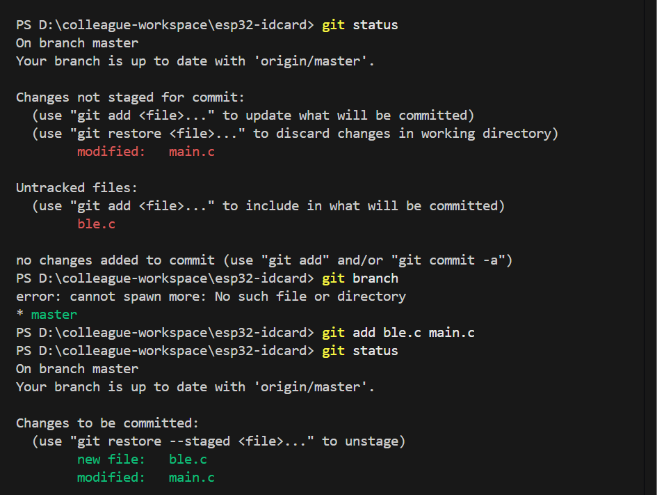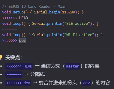 我们使用指令git add . 来将当前目录下所有文件和子目录添加到暂存区,就是为了开始跟踪所有未跟踪的文件,并暂存所有修改。Changes to be committed:表示有改变并将要提交的文件,也给你用绿色列出来了,就是我们刚添加到暂存区的main.c文件。然后我们调用git commit -m "feat: initial project setup for ESP32 ID card reader"这句命令来将暂存区的文件提交到本地仓库
