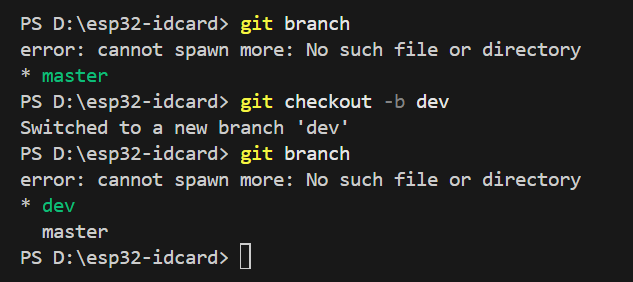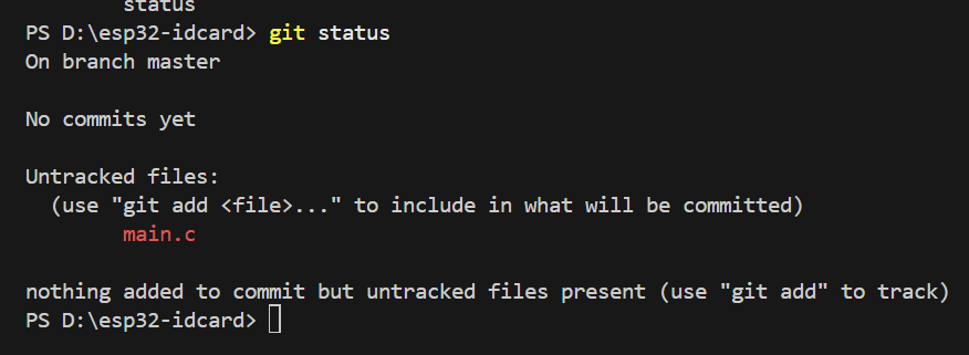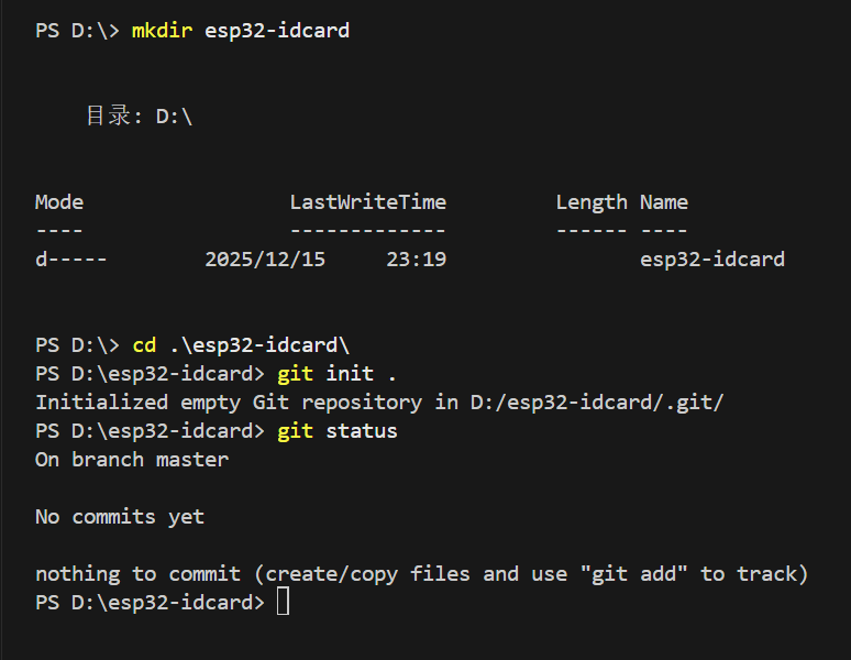 我们先用mkdir创建了一个esp32-idcard的文件夹,然后在这个文件夹中使用指令git init . 这里的点表示的是当前目录(D:\esp32-idcard)这个指令是用来初始化Git仓库,然后我们继续执行git status 来查看当前状态,根据根据反馈信息我们得到