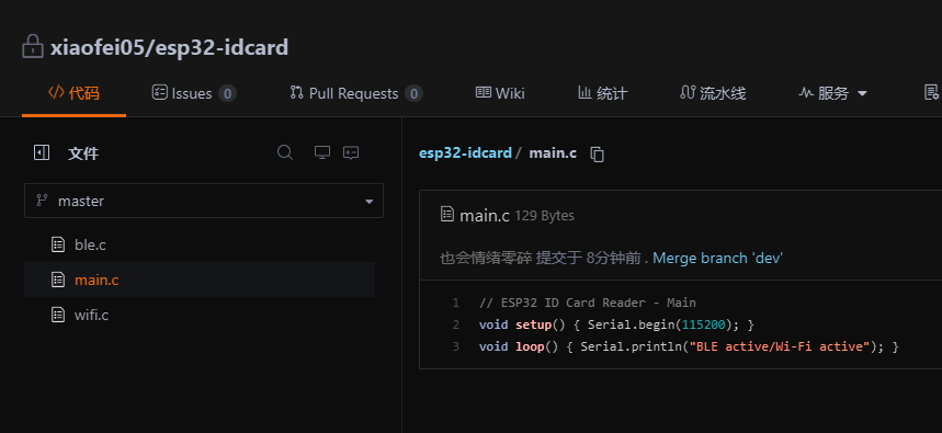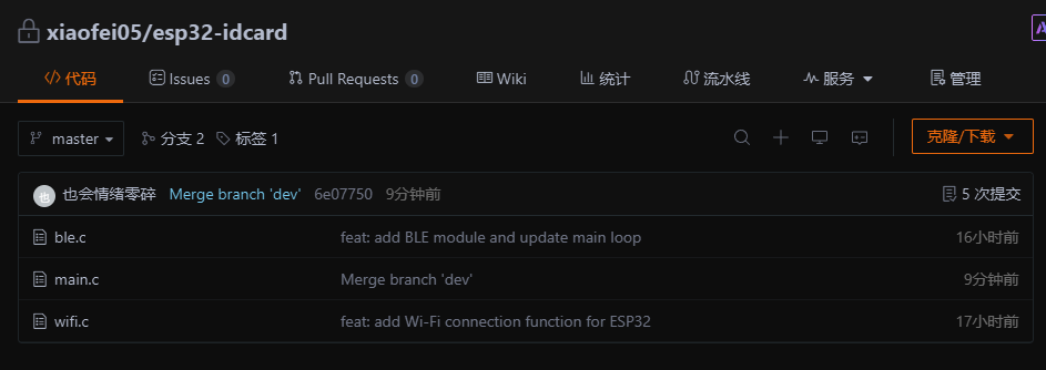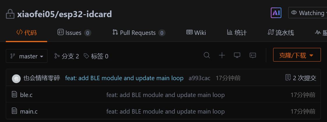 当我们提交代码并推送之后我们发现,我们的主分支master多了个ble.c文件和main.c文件被修改了