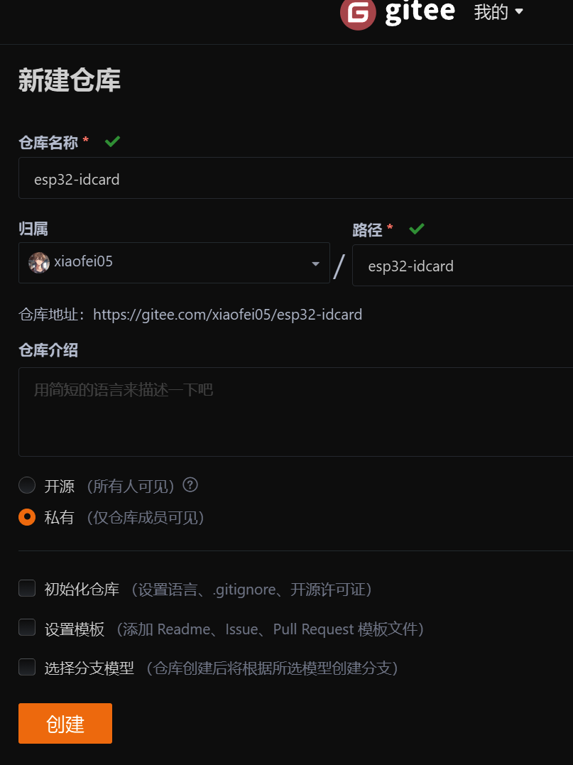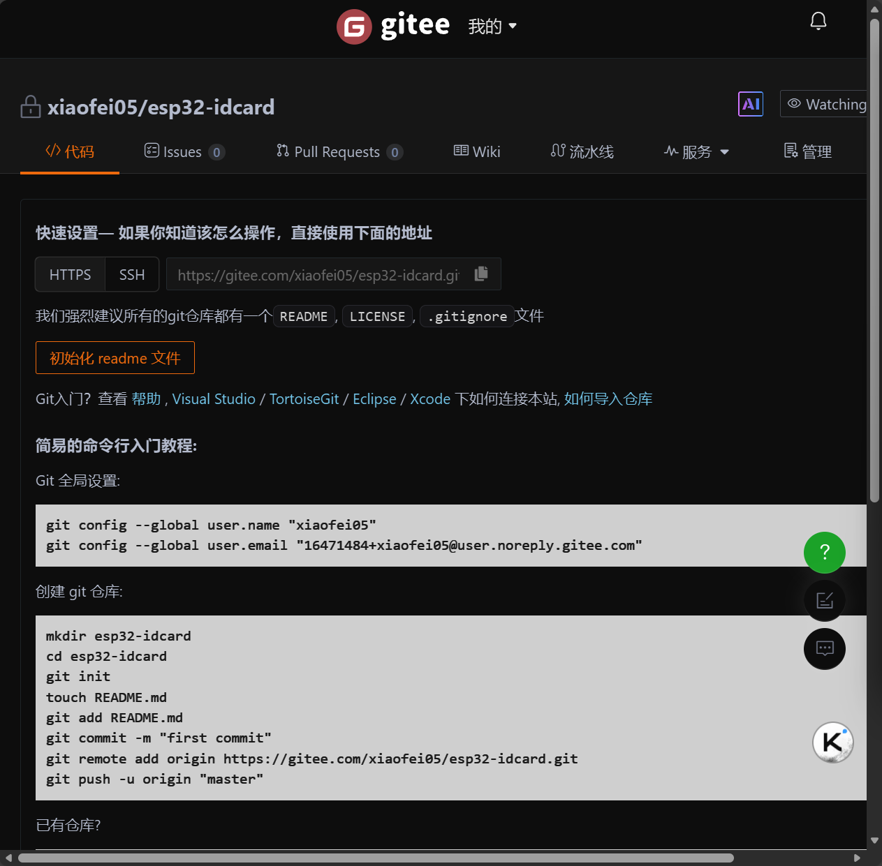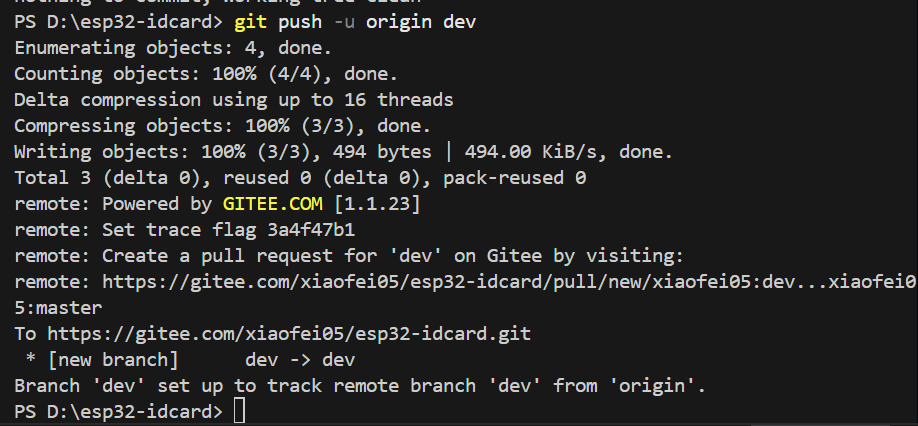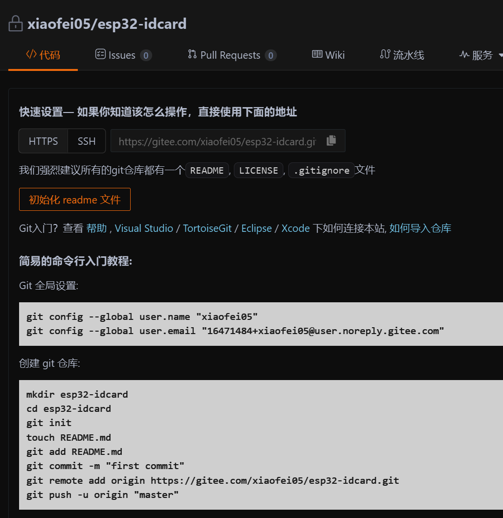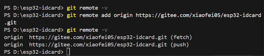 接下来我们输入git remote -v 这条命令来查看远程仓库配置,我们可以看到啥也没有,然后我们使用git remote add origin https://gitee.com/xiaofei05/esp32-idcard.git 这条命令来添加我们的远程仓库,这里的https地址需要换成你自己的,最后再次输入git remote -v指令,发现我们以及添加成功。其中有几个注意的点是