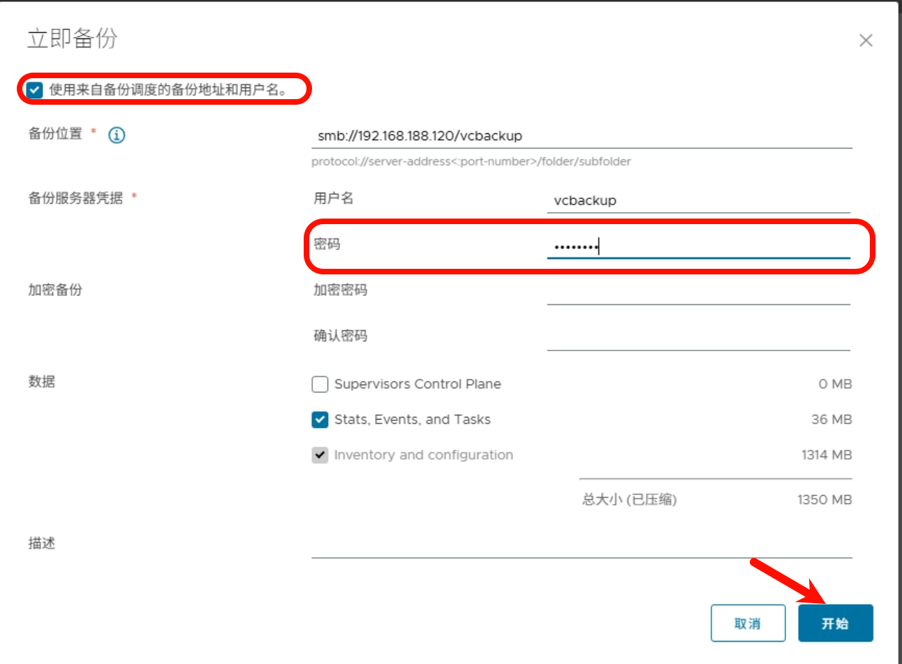 勾选使用来自备份调度的备份地址和用户名,然后输入密码,点击开始即可进行备份