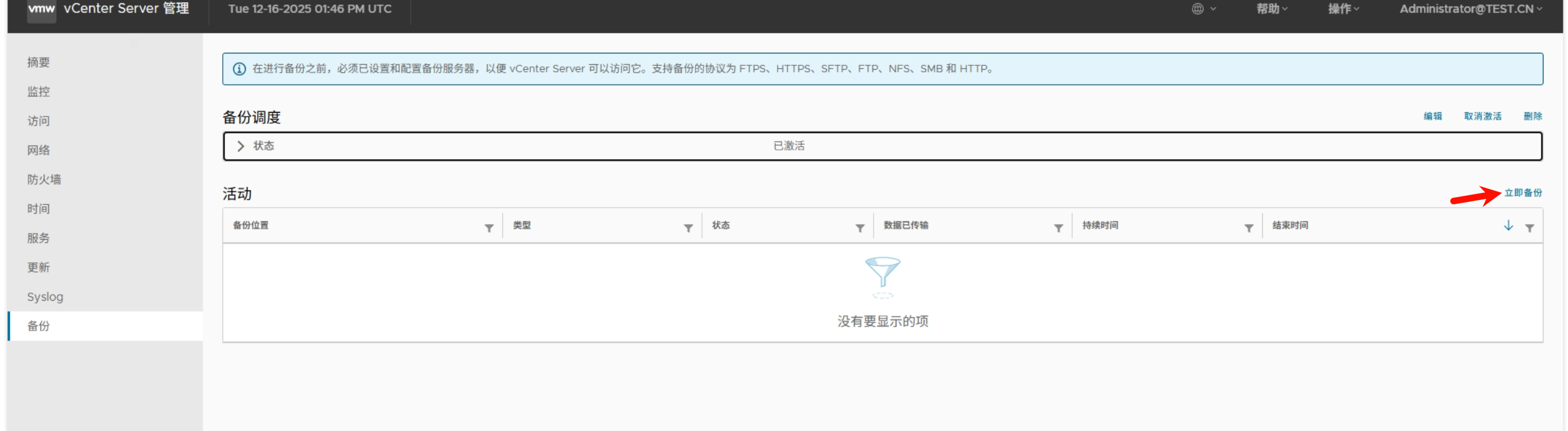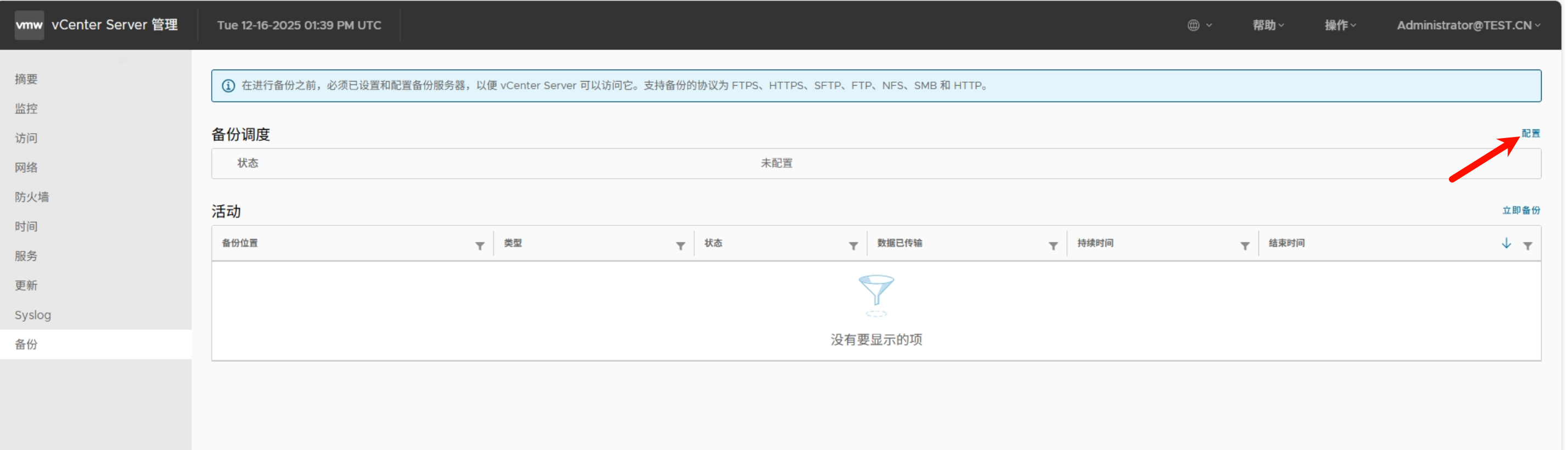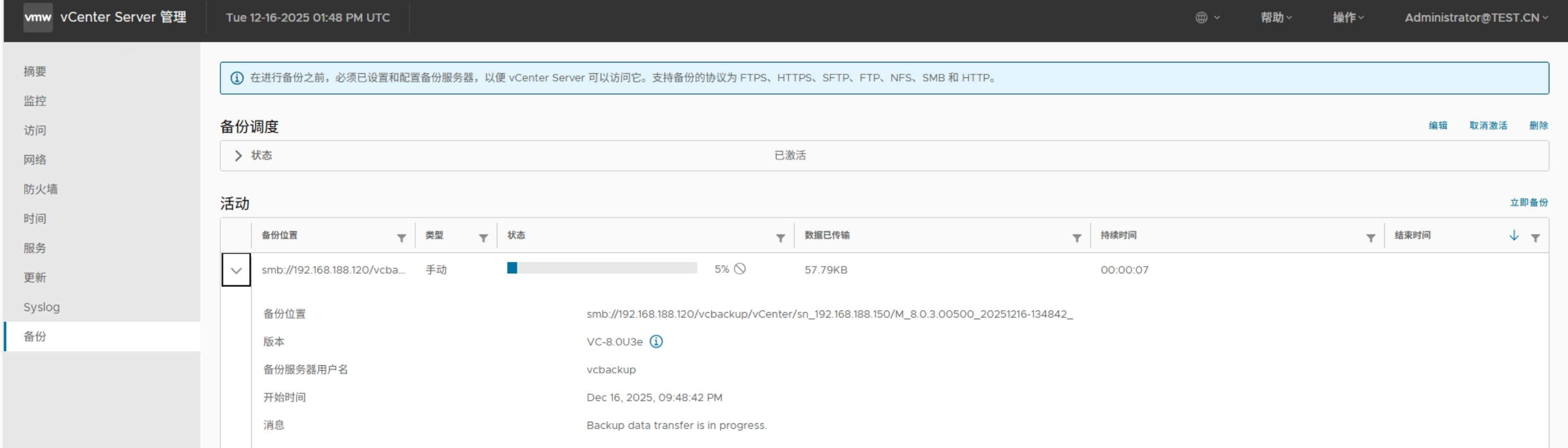 登录vcenter管理web(https://vc管理IP:5480),点击备份-备份调度-配置