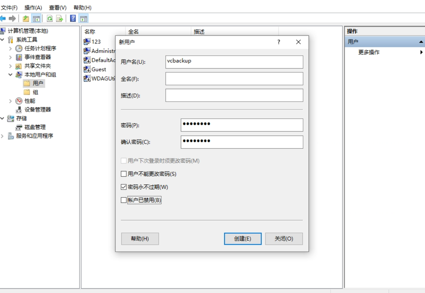 在SMB服务器上创建专用于备份的用户,我这里创建的用户是vcbackup,勾选密码永不过期,点击创建