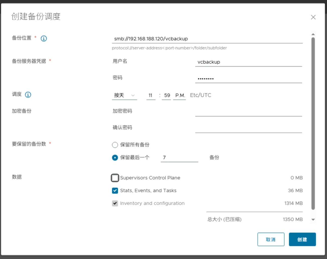 备份位置为:smb://smb服务器IP地址/备份文件夹共享名称,我这里就是smb://192.168.188.120/vcbackup,用户名就是前面创建的备份用户(vcbackup),密码就是备份用户的密码;调度选择按天进行备份(时间任意,建议选择晚上);要保留的备份数我这里是7,代表保留一个星期的备份,点击创建