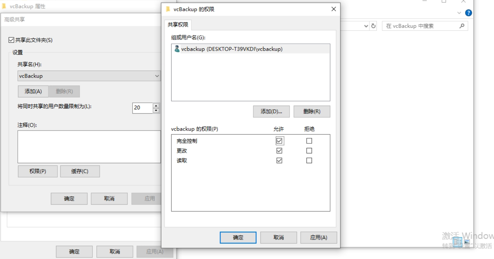 在SMB服务器上新建一个文件夹(我这里创建的文件夹名称也是vcbackup),共享此文件,给vcbackup完全控制权限,点击确定