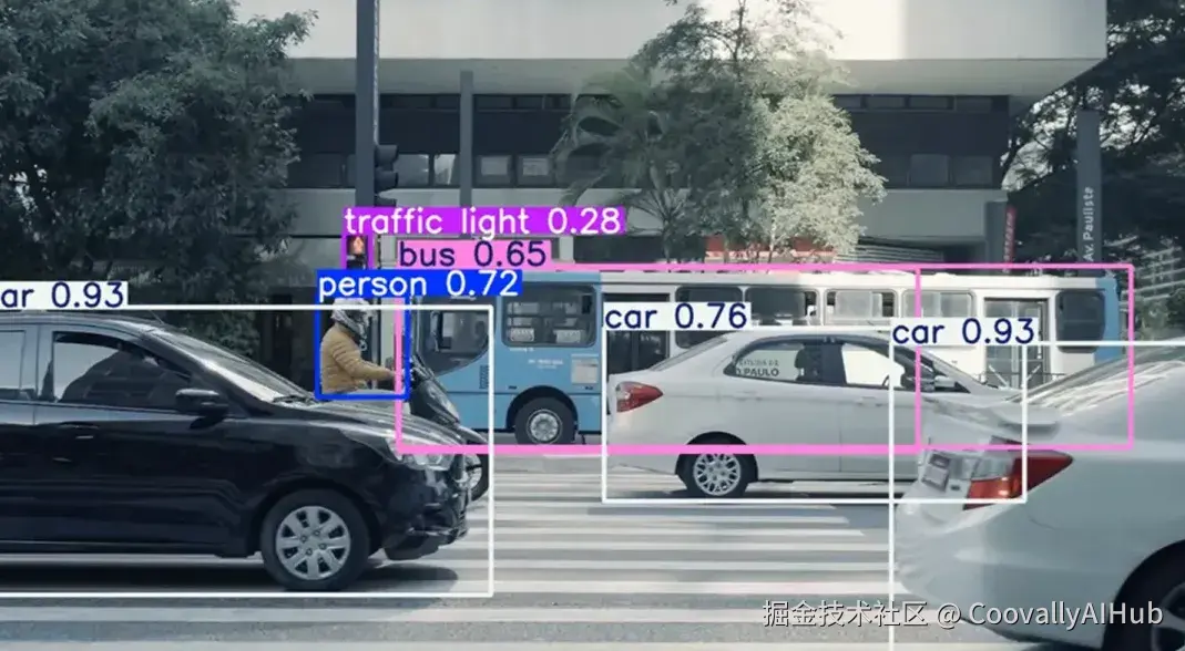 物体检测是计算机视觉的一项核心任务,视觉 AI 模型借此识别并定位图像或视频帧中的物体。通过分析像素数据,物体检测模型可以生成三个主要输出:边界框、物体类别和置信度分数。边界框显示物体的位置,物体类别表明它是什么(如汽车、行人或骑行者),置信度分数则反映模型对预测的把握程度。