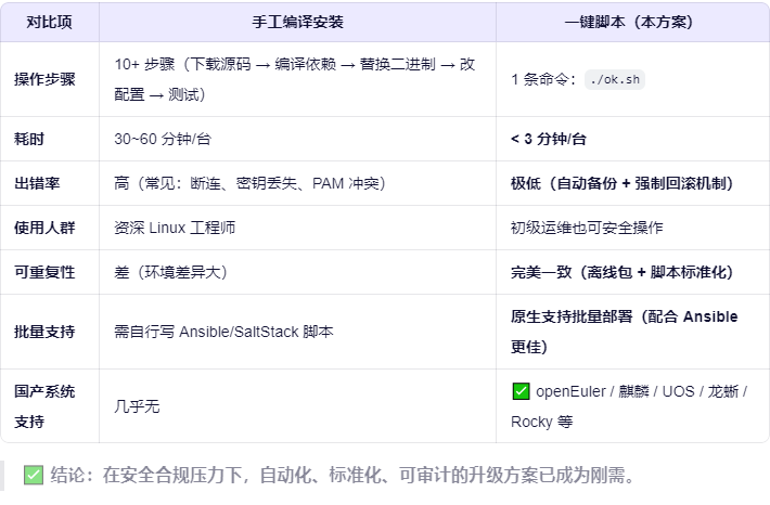 手工编译 OpenSSH 极其繁琐:依赖 OpenSSL、Zlib、PAM、SELinux 上下文......稍有不慎就"断连"。