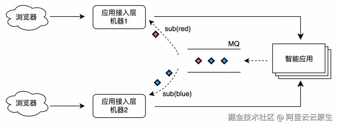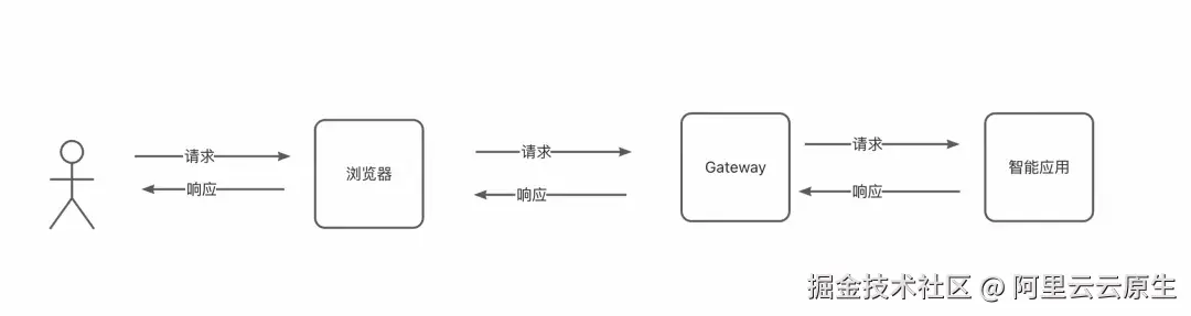 下图以典型的 AI 会话场景为例:用户所连接的 Gateway 不仅需要发送请求,还需要处理推理响应结果,并将结果推送给浏览器,形成完整的交互闭环。