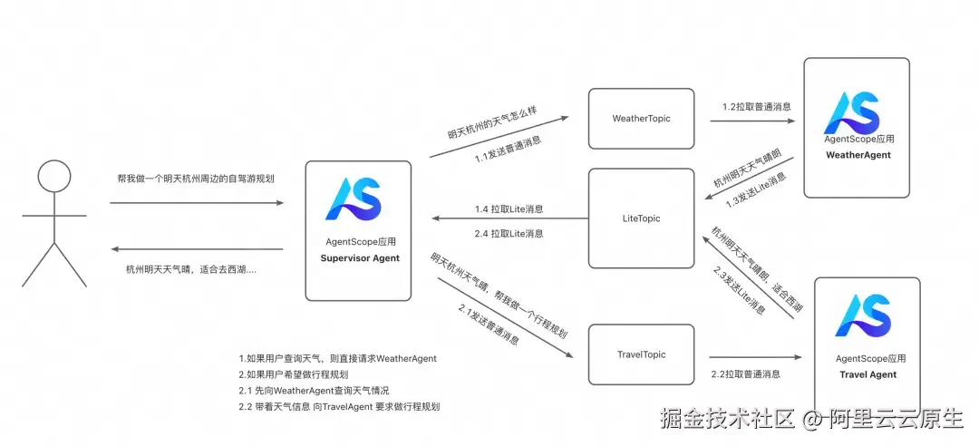- 如果用户希望做出行程规划,则先向 WeatherAgent 发出天气查询请求,获取对应天气信息后,再带着天气信息向 TravelAgent 发出行程规划请求,TravelAgent 对行程结果进行规划后将响应结果发送至 SupervisorAgent 订阅的 LiteTopic,SupervisorAgent 应用将结果发送至用户侧。