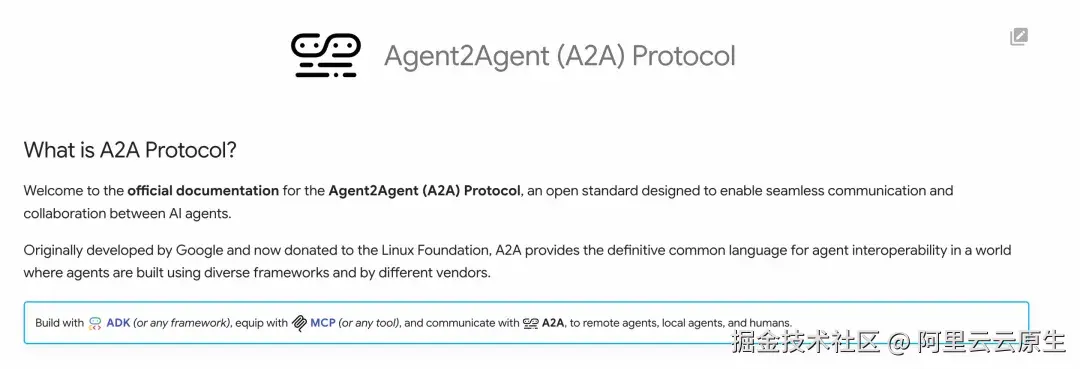 Agent-to-Agent(简称 A2A)是一项由 Google 于 2025 年发起,并贡献至 Linux 基金会的开源通信协议。其核心目标是建立跨厂商、跨框架的标准化互操作机制,使异构 AI 智能体(Agents)能够自动发现、可靠通信并高效协作,从而构建开放、可组合、可扩展的多智能体系统生态。