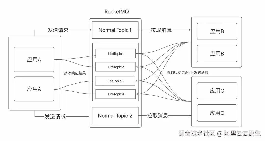 - 应用 C 集群则从 Normal Topic2 拉取消息进行处理,并同样将结果写入该 LiteTopic。