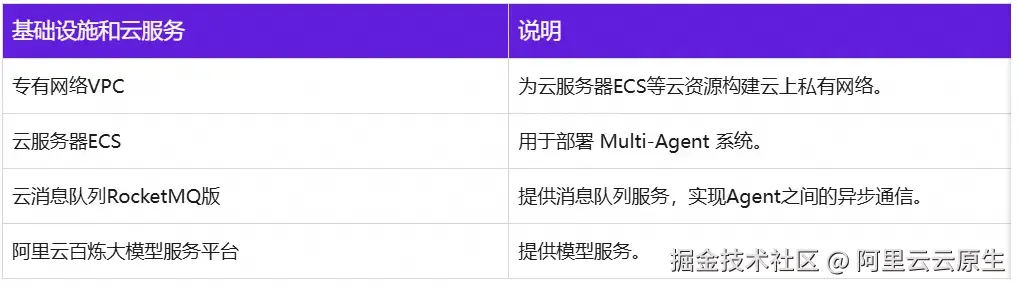 为简化部署过程,我们将在 1 台云服务器 ECS 上部署 3 个独立的 Agent(SupervisorAgent,WeatherAgent 和 TravelAgent,具体功能可参考 4.3),并且通过 RocketMQ 消息服务实现 Agent 之间的异步通信。
