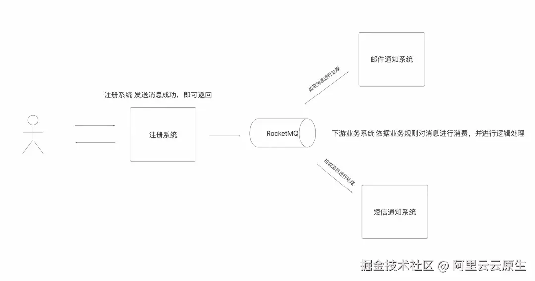 下图以注册系统为例:用户发起账户注册请求后,注册系统向 RocketMQ 发送"新用户注册"的消息后便立即返回,无需关心下游的邮件或短信通知系统如何处理。邮件或短信通知系统再分别从 RocketMQ 拉取消息,驱动各自的发送流程。整条业务链路为单向、无反馈的事件驱动模式。