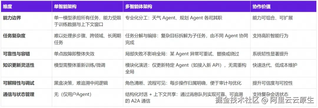 在深入探讨如何构建 A2A 通信之前,我们首先需要理解,为什么多智能体协同是必然趋势。我们从六个维度对比单智能体与多智能体的能力差异:
