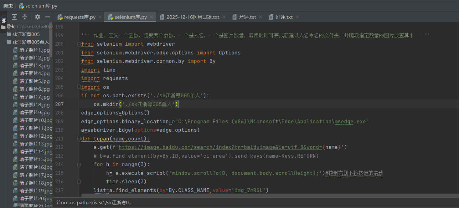 任务:定义一个函数,接受两个参数,一个是人名,一个是图片数量,调用时即可完成新建以人名命名的文件夹,并爬取指定数量的图片放置其中
