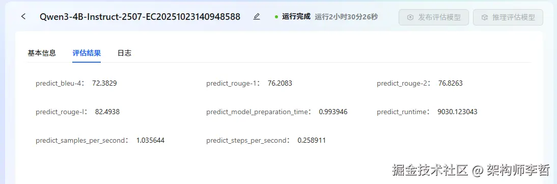 训练完成后,可在 LLaMA-Factory Online 上对模型进行全面评估,并查看评估任务的基本信息、日志及结果: