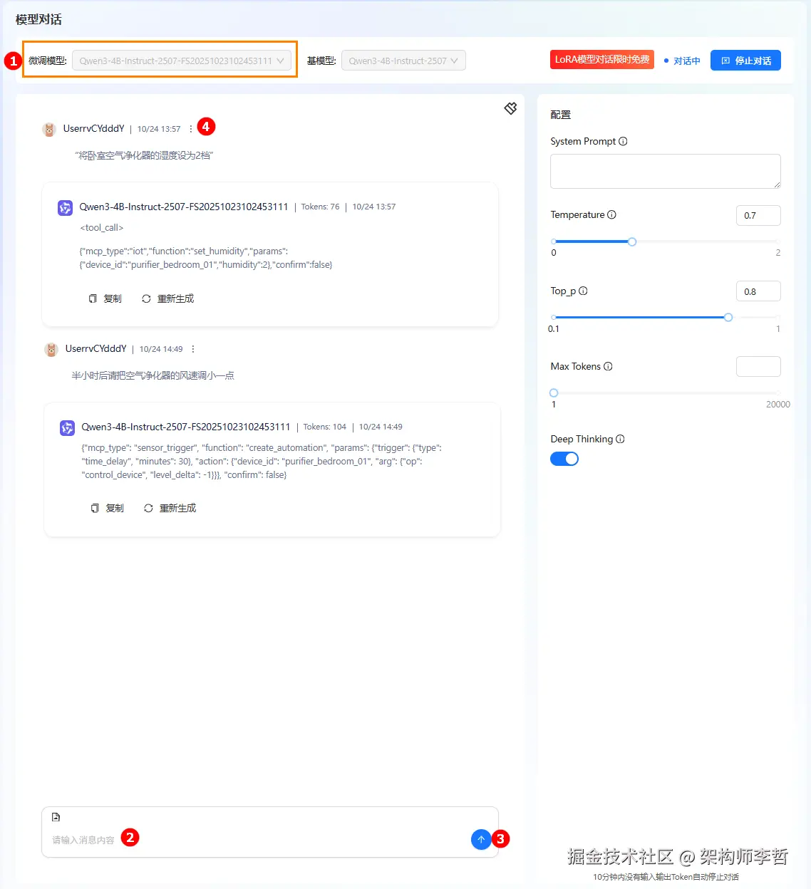 在"模型对话"界面选择微调后的模型,即可实时体验复杂指令解析: