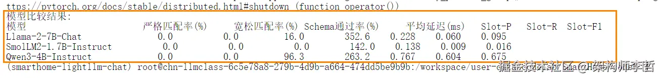 ● 输出与期望结果对比。 将模型生成的具体内容与验证集中每条样本的 expected_events 期望结果进行对比,以评估模型在内容层面的准确性。每条样本的 expected_events 列出该指令正确的执行动作列表(每个包含应执行的动作类型、设备ID、参数等)。