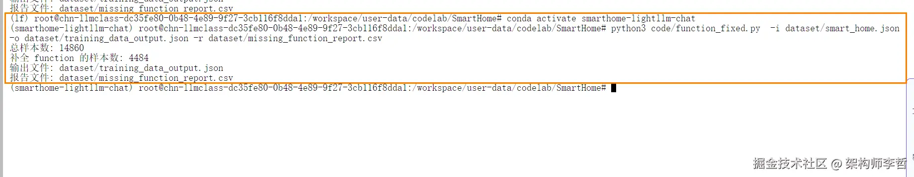 进入"SmartHome"文件夹,新建终端,激活 Python 环境 smarthome-lightllm-caht ,在命令行输入以下指令运行脚本,完成数据集的"funcion"字段补全。