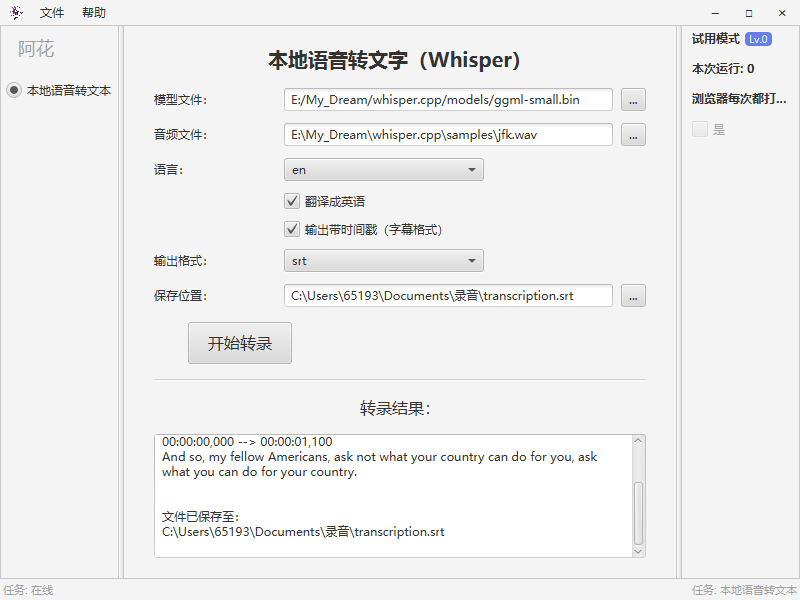 build\bin\Release\whisper-cli.exe -m models/ggml-small.bin -f samples/jfk.wav