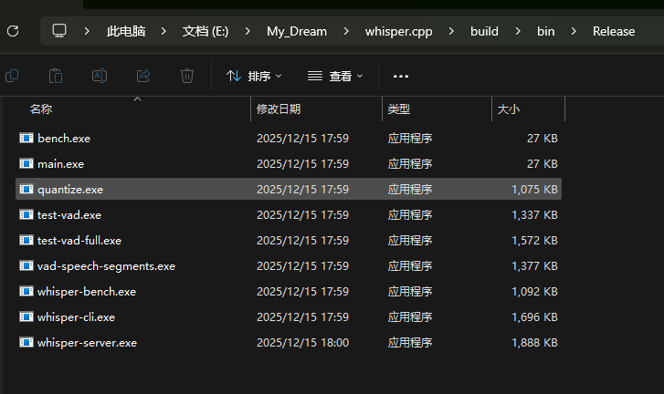 成功构建后,可执行文件(如 whisper-cli.exe、main.exe 等)将位于 build\bin\Release\ 目录下。