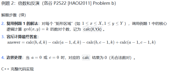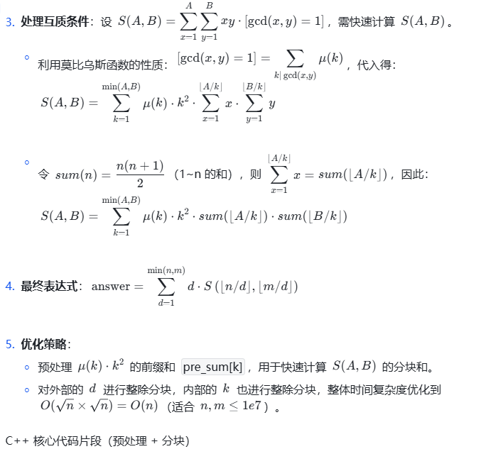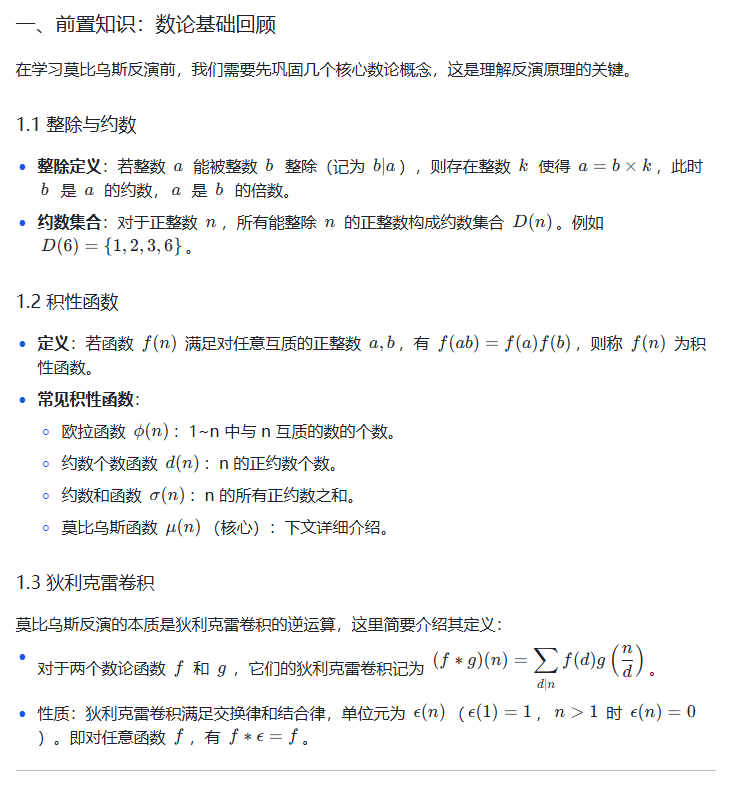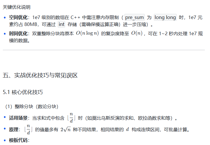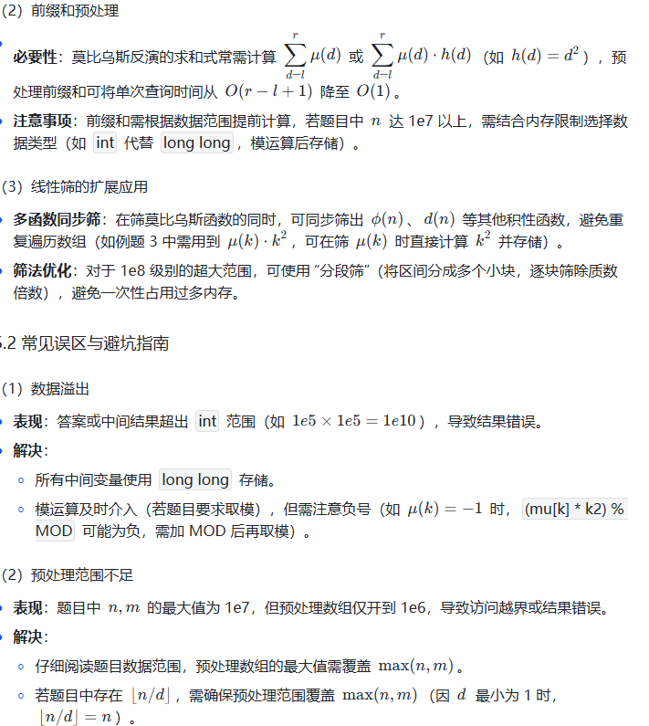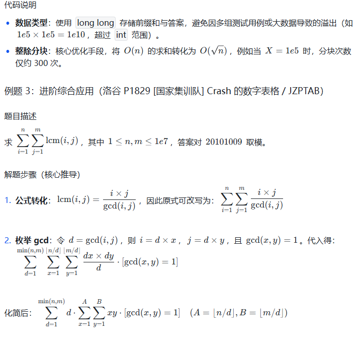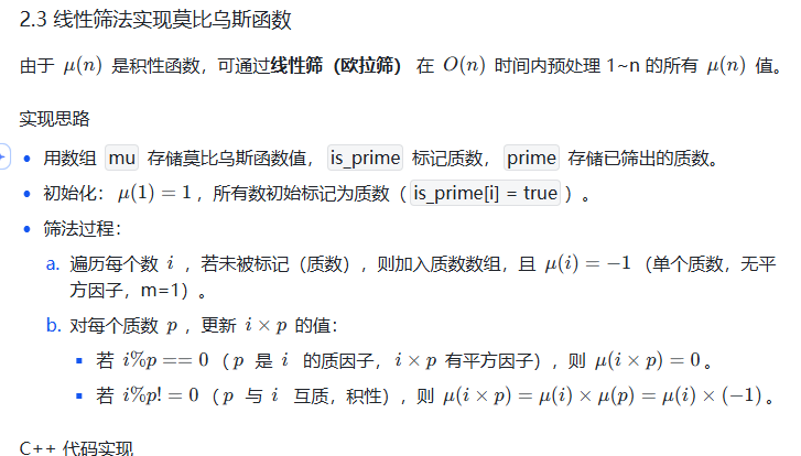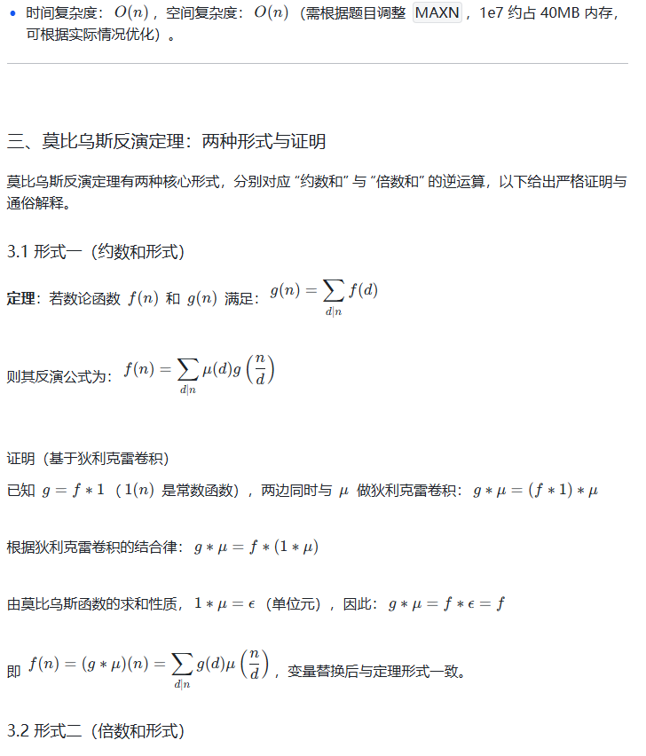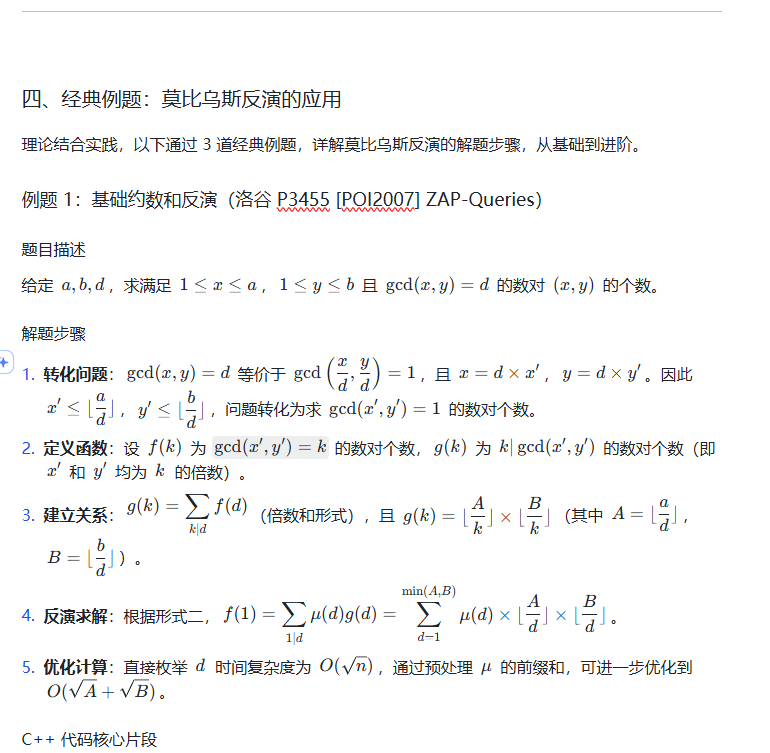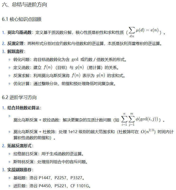 算法竞赛中,莫比乌斯反演常与整除分块、前缀和、线性筛结合出现,建议将这些知识点串联学习,形成完整的数论解题体系。祝你在数论的世界里越走越远!