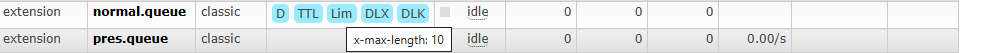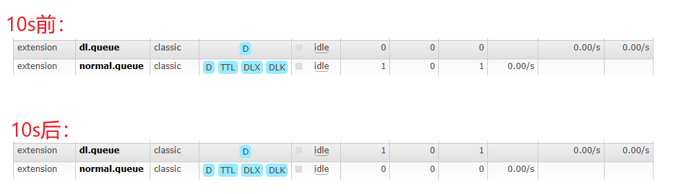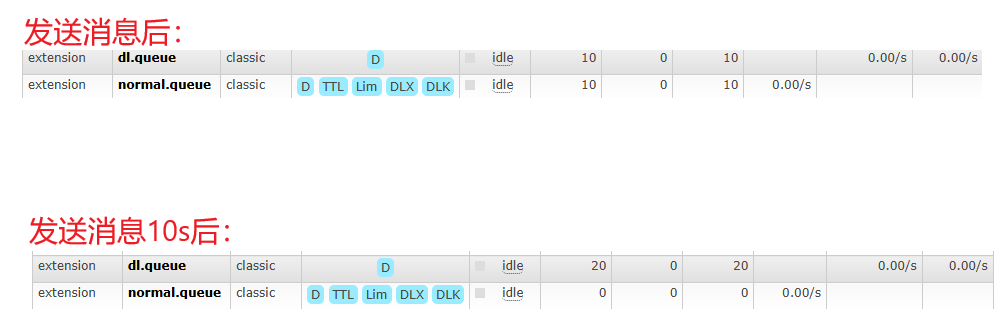 可以看到发送消息后,有10条消息因为超过队列长度被放到死信队列中;10s后,又有10条消息因为过期被放到死信队列中。