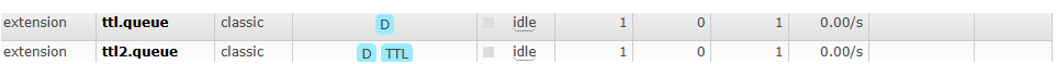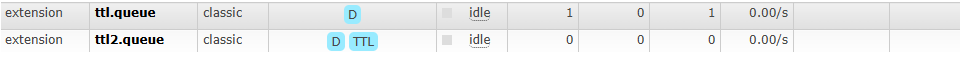 发送消息之后,可以看到ttl1队列和ttl2队列中多了一条消息: