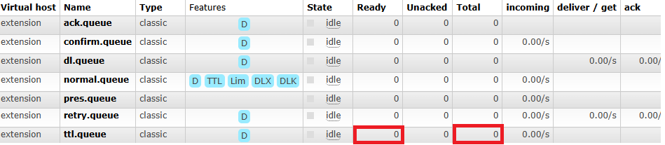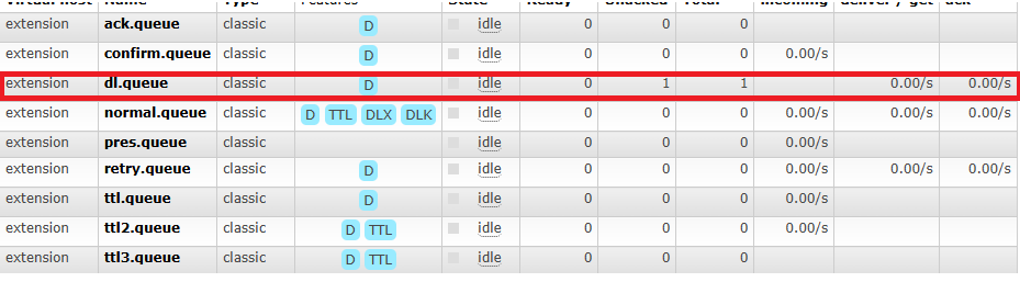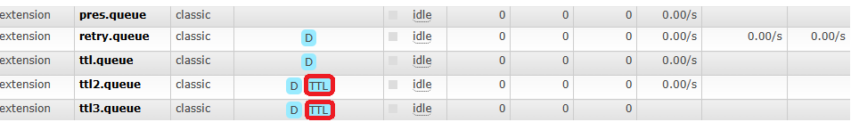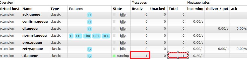 运行完之后,发现新增了两个队列,队列Features有一个TTL标识: