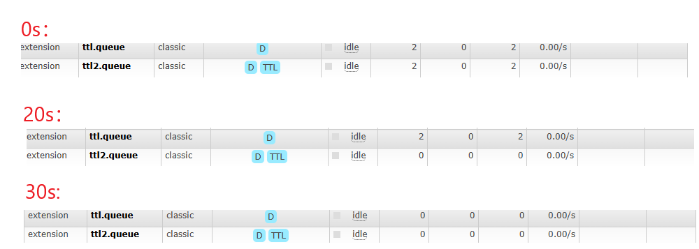 20s之后,刷新页面,ttl2队列中的消息消失,因为ttl队列未设置过期时间,且发送的是普通消息,所以ttl_queue的消息未删除: