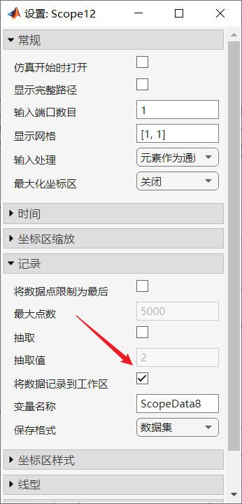 Scope中打开将数据记录到工作区