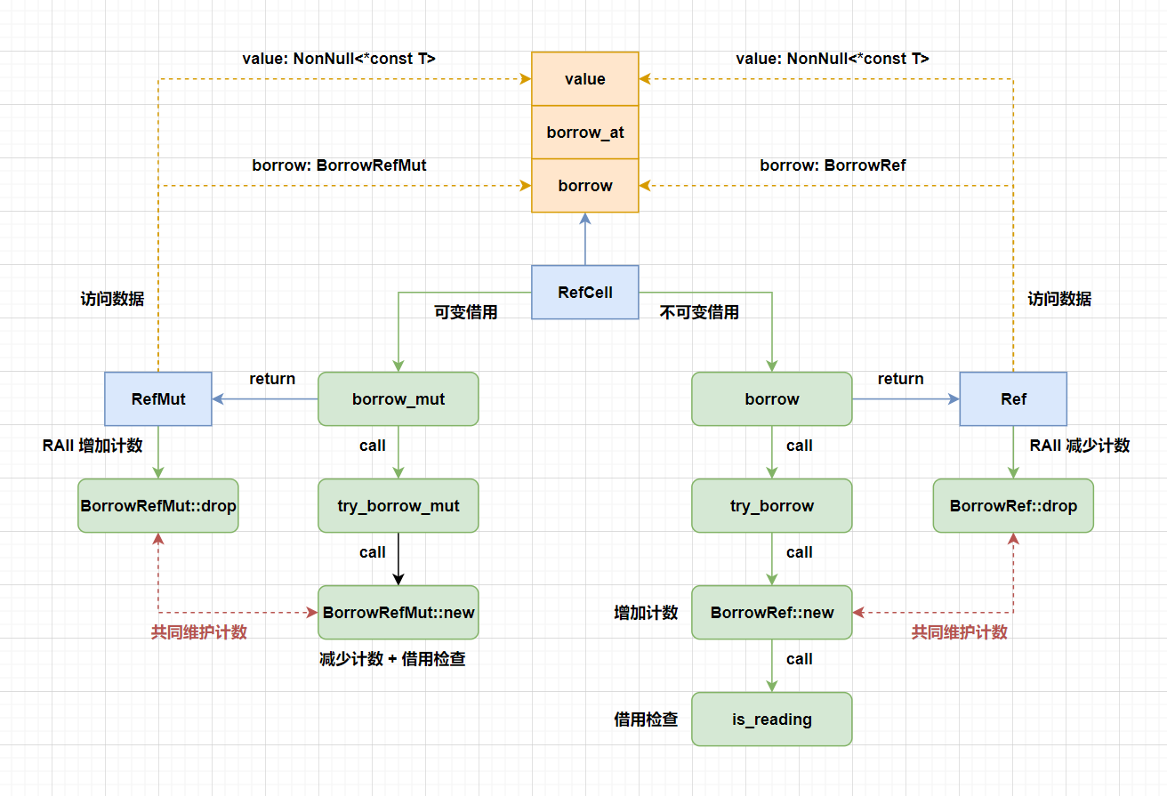 因为这个RefMut可以当做一个可变借用,它在运行时维护。思考一下RefMut和一个真正的借用还有哪些区别?