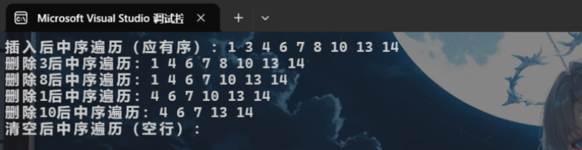 结果符合预期,证明 BST 的插入、删除操作均保持了 "中序遍历有序" 的核心特性。
