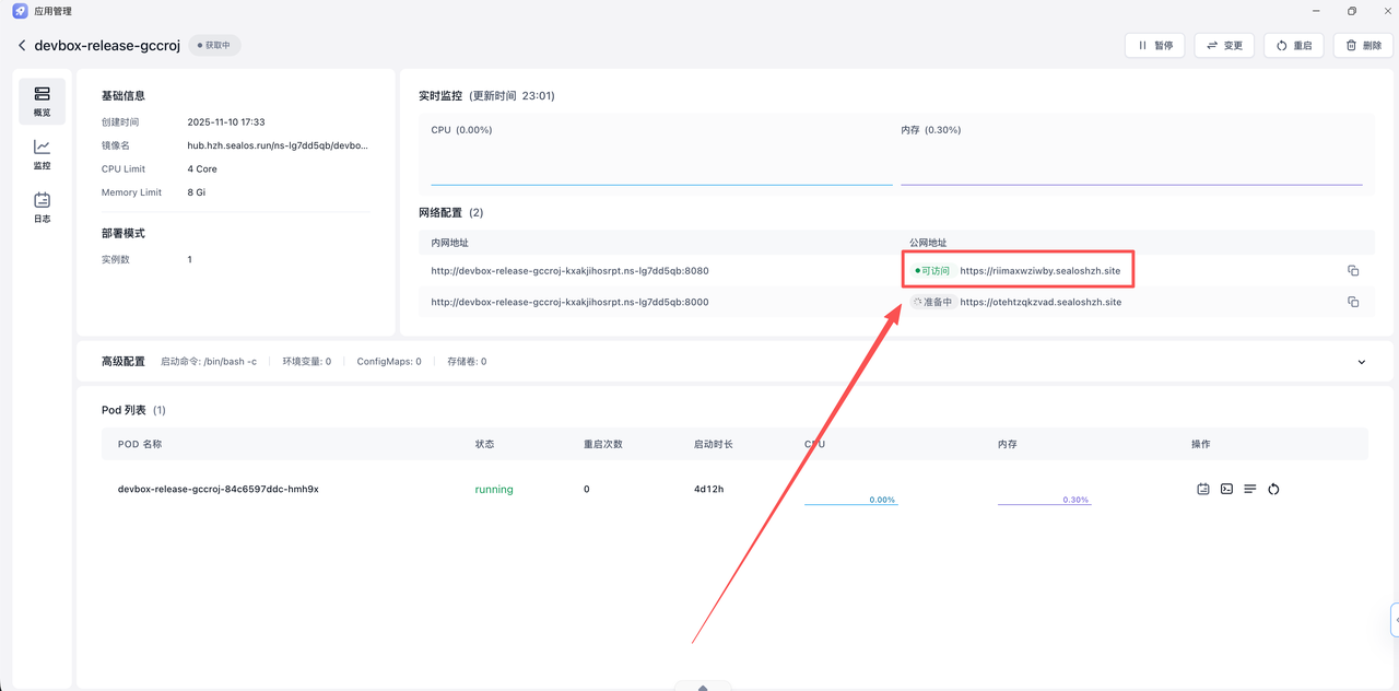 4.自动跳转至应用管理,配置并完成部署。 版本发布成功后,系统自动跳转到应用管理界面,并为我填好了刚刚发布的镜像地址。我只需要开启外网访问、设置好端口,点击"部署应用",不到3分钟,应用就成功运行并分配了一个公网域名。 从此,我再也不用去手动配置Nginx或折腾HTTPS证书了。