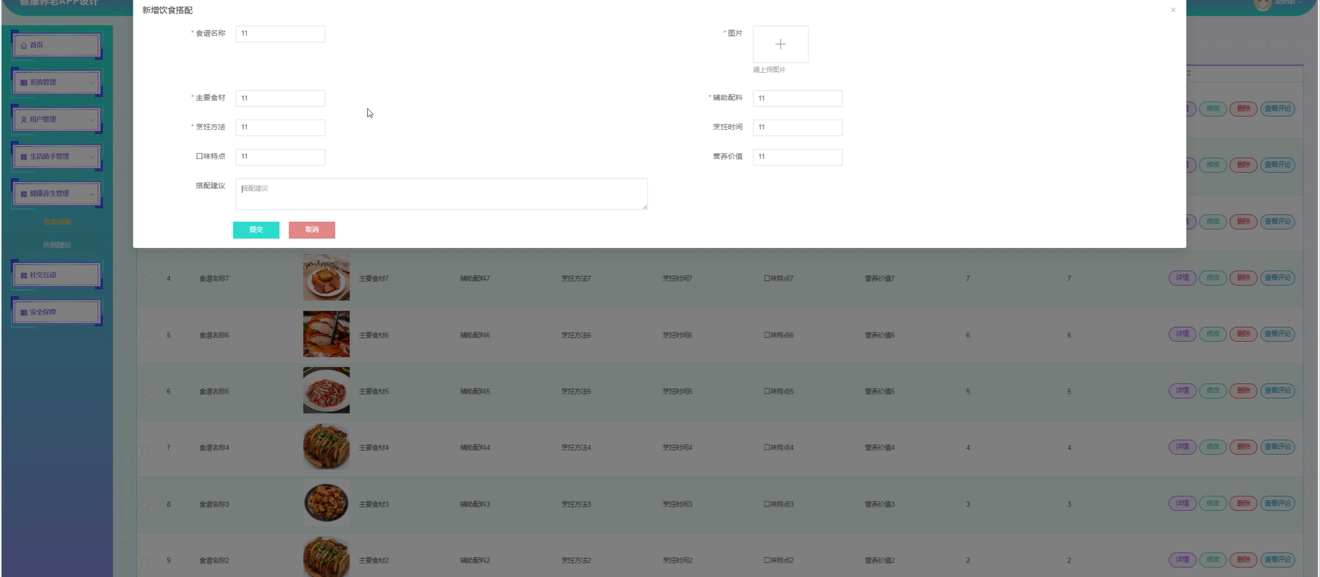 - 饮食搭配:用户录入身体状况(如糖尿病、高血压)及口味偏好,系统通过算法推荐健康食谱,提供营养成分分析,支持饮食日志记录;