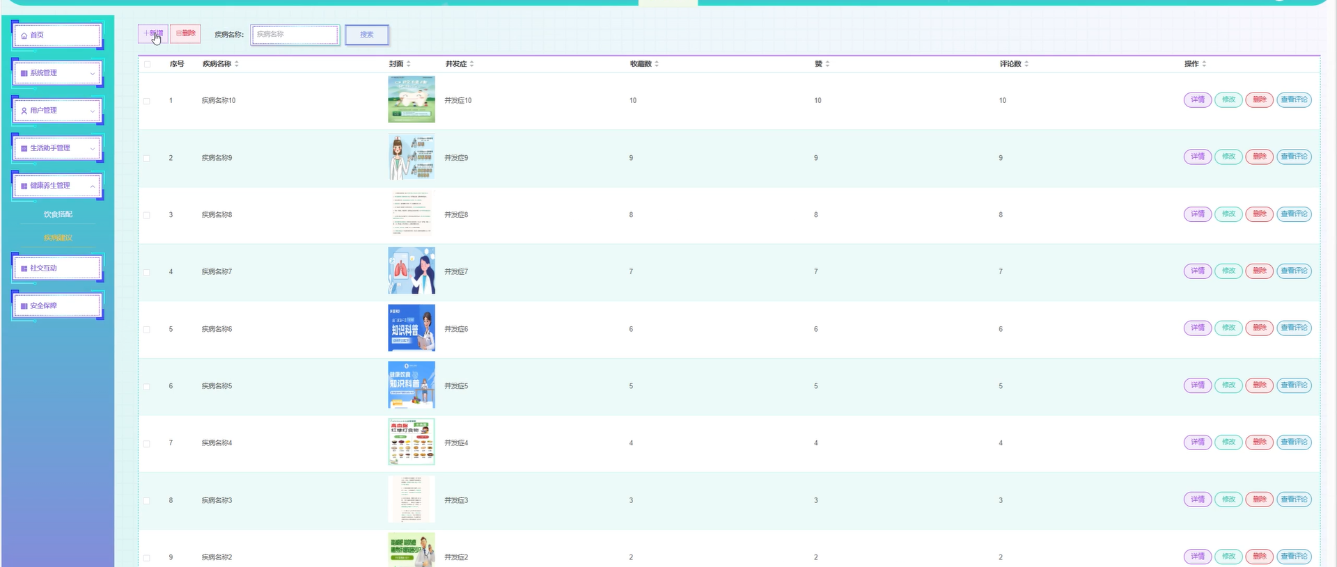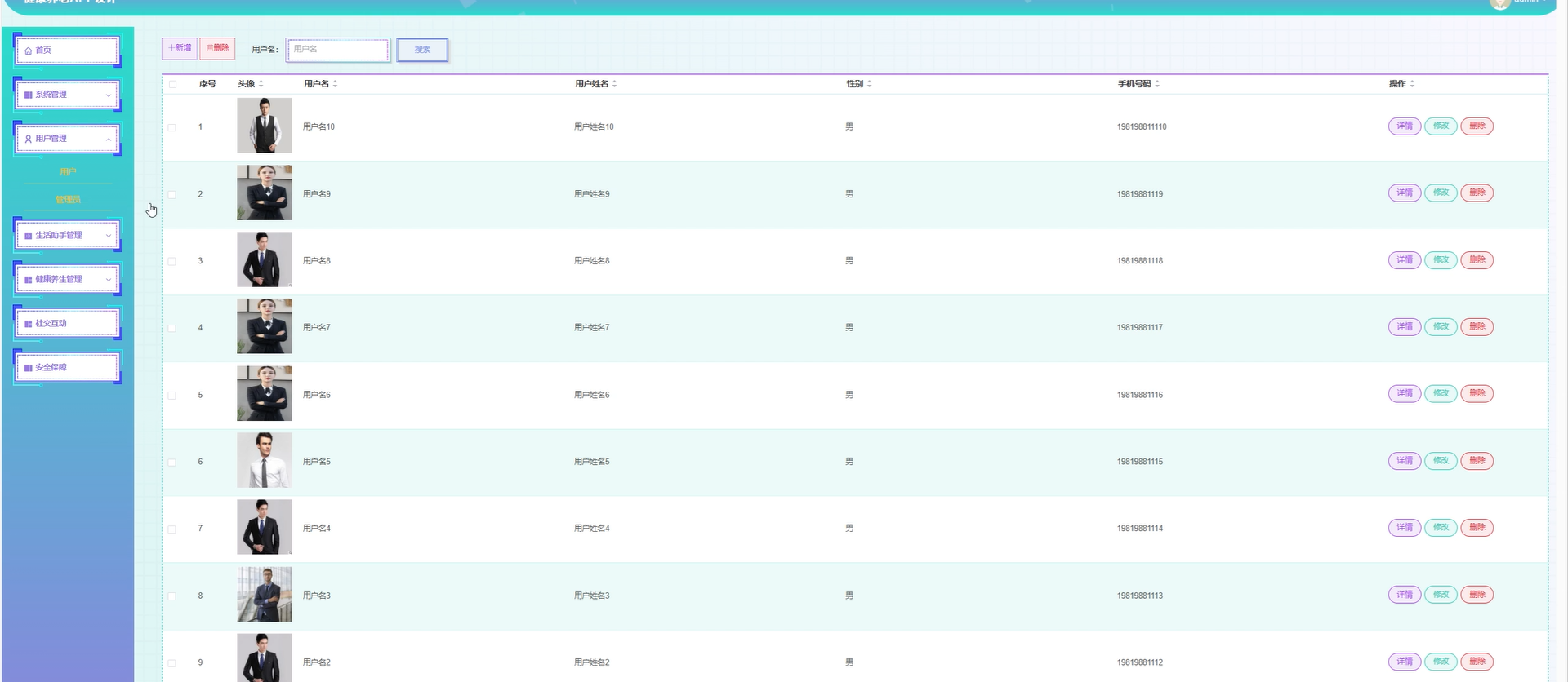- 管理员层:登录权限、系统管理、用户管理、生活助手管理、健康养生管理五大核心模块;