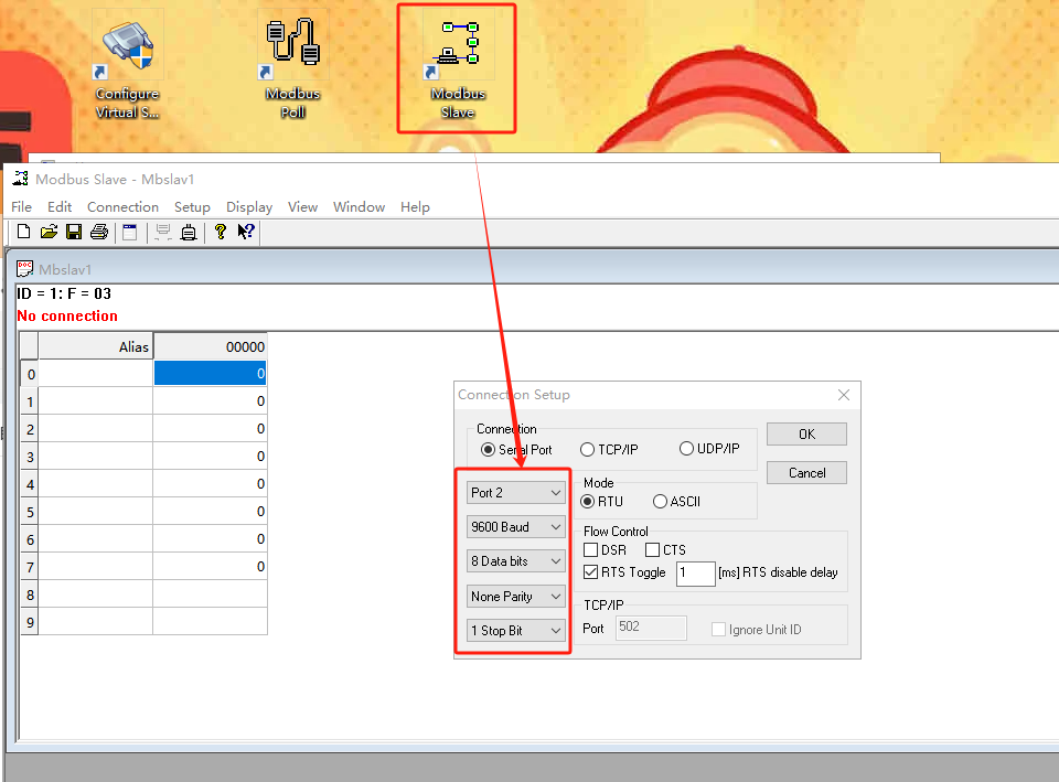 二、使用modbus Slave 虚拟出来一个modbus从机。并设置调试的寄存器个数,这里需要调试的寄存器个数为8个,连接串口2,配置波特率为9600,如下图