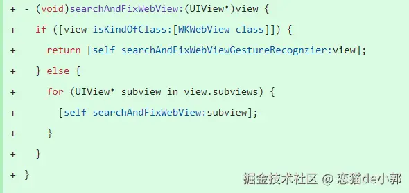 searchAndFixWebView: 一个递归函数,它会遍历视图层级,如果遇到的视图是WKWebView类型,它就会调用修复手势的方法,执行searchAndFixWebViewGestureRecognzier,确保即使WKWebView被嵌套在其他UIView中也能被找到
