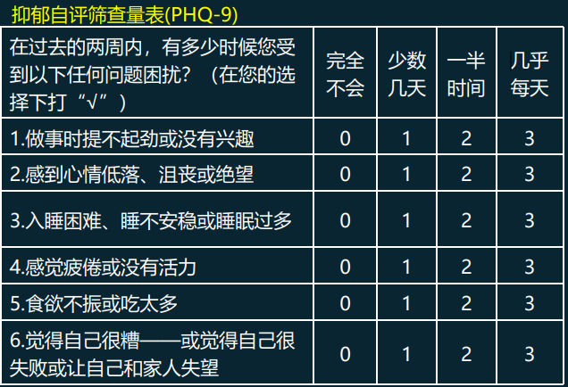 - PHQ-9/GAD-7:分别筛查抑郁和焦虑,≥10分建议就医。