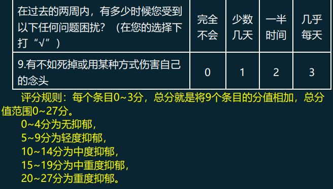 自评量表 适用于临床心理咨询 或是流行病学调查 ,自评量表的敏感性 和特异性较筛查提问更高。