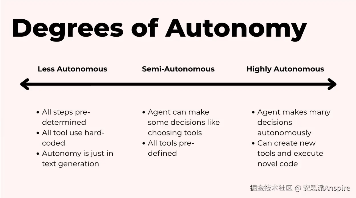 实际上,大多数现实世界中的智能体处于中间状态,属于半自主智能体。智能体从你定义的工具中进行选择,并在你设定的规则范围内做出决策。
