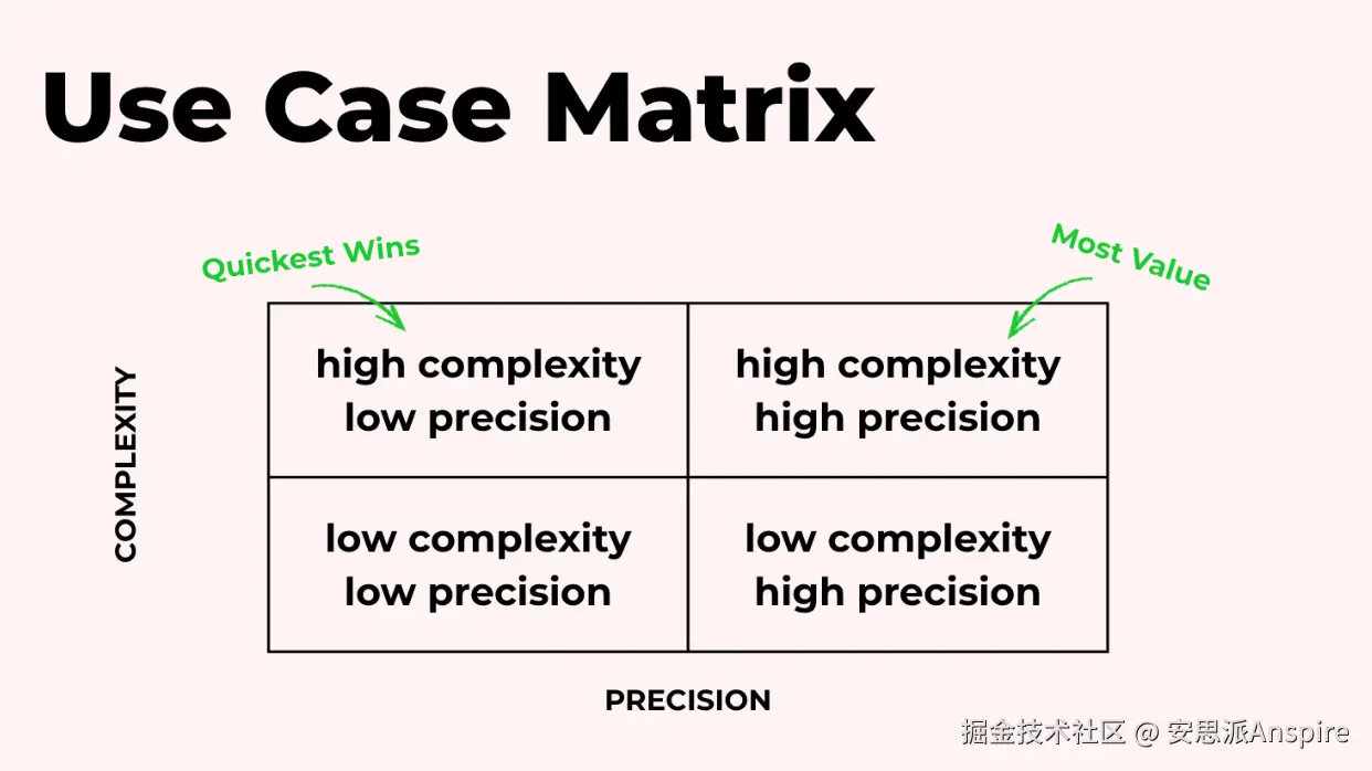 最大的价值往往来自高复杂度的工作,而最快的早期成果往往出现在低精度的方面。这就是为什么高复杂度、低精度的象限通常是明智的起点。你可以通过自动化处理棘手的事情获得助力,而不会每次都因需要完美的输出而受阻。