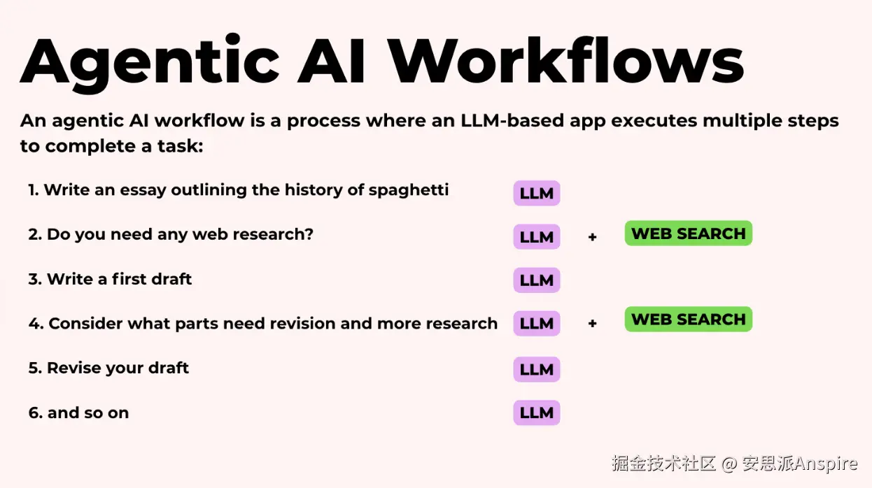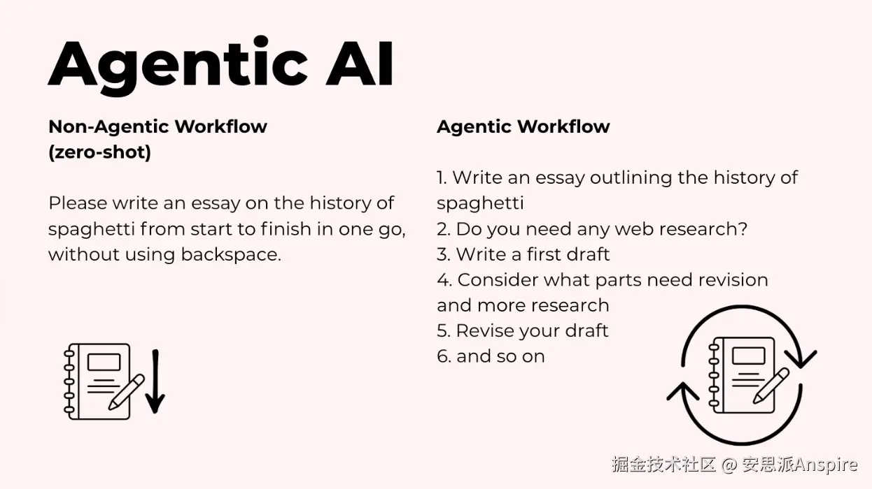 这是最简单的思考方式。想象一下,你需要写一篇文章。如果你使用传统的大语言模型(LLM)提示,你基本上会说:"嘿,ChatGPT,给我写一篇关于如何开始健身的文章",然后它就会从头到尾一次性写完整个内容。